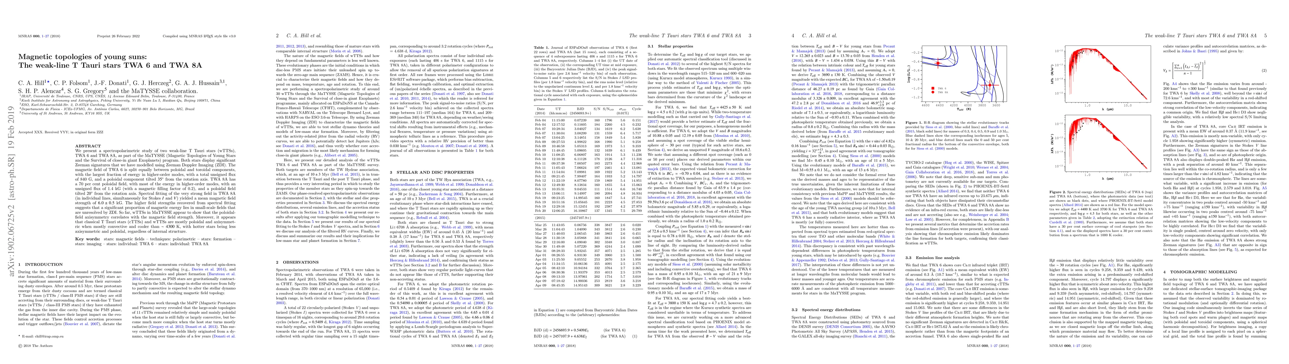 We present a spectropolarimetric study of two weak-line T Tauri stars (wTTSs), TWA 6 and TWA 8A, as part of the MaTYSSE (Magnetic Topologies of Young Stars and the Survival of close-in giant Exoplanets) program. Both stars display significant Zeeman signatures that we have modelled using Zeeman Doppler Imaging (ZDI). The magnetic field of TWA 6 is split equally between poloidal and toroidal components, with the largest fraction of energy in higher-order modes, with a total unsigned flux of 840 G, and a poloidal component tilted $35^{\circ}$ from the rotation axis. TWA 8A has a 70 per cent poloidal field, with most of the energy in higher-order modes, with an unsigned flux of 1.4 kG (with a magnetic filling factor of 0.2), and a poloidal field tilted $20^{\circ}$ from the rotation axis. Spectral fitting of the very strong field in \tb (in individual lines, simultaneously for Stokes $I$ and $V$) yielded a mean magnetic field strength of $6.0\pm0.5$ kG. The higher field strengths recovered from spectral fitting suggests that a significant proportion of magnetic energy lies in small-scale fields that are unresolved by ZDI. So far, wTTSs in MaTYSSE appear to show that the poloidal-field axisymmetry correlates with the magnetic field strength. Moreover, it appears that classical T Tauri stars (cTTSs) and wTTSs are mostly poloidal and axisymmetric when mostly convective and cooler than $\sim4300$ K, with hotter stars being less axisymmetric and poloidal, regardless of internal structure.