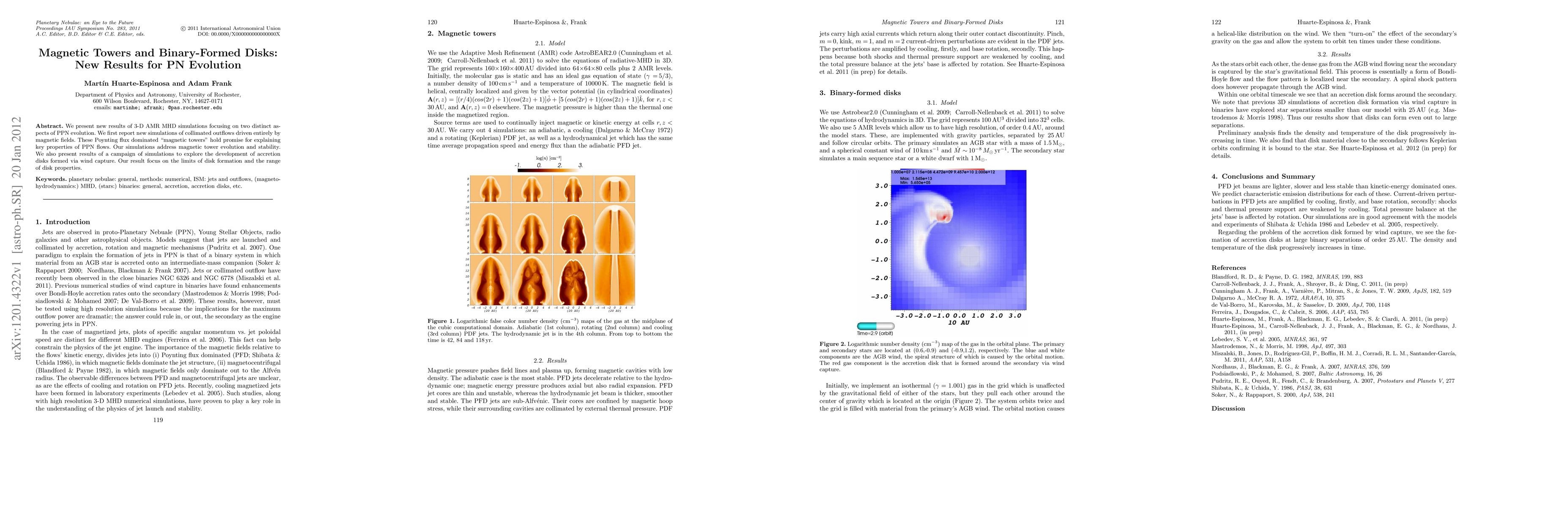 This paper reports on 3-D MHD simulations exploring two aspects of post-AGB (PPN) evolution: magnetic towers driven by magnetic fields and binary-formed accretion disks. The study finds that magnetic towers are stable and may explain key properties of PPN flows, while also detailing the conditions and properties of disks formed through wind capture.