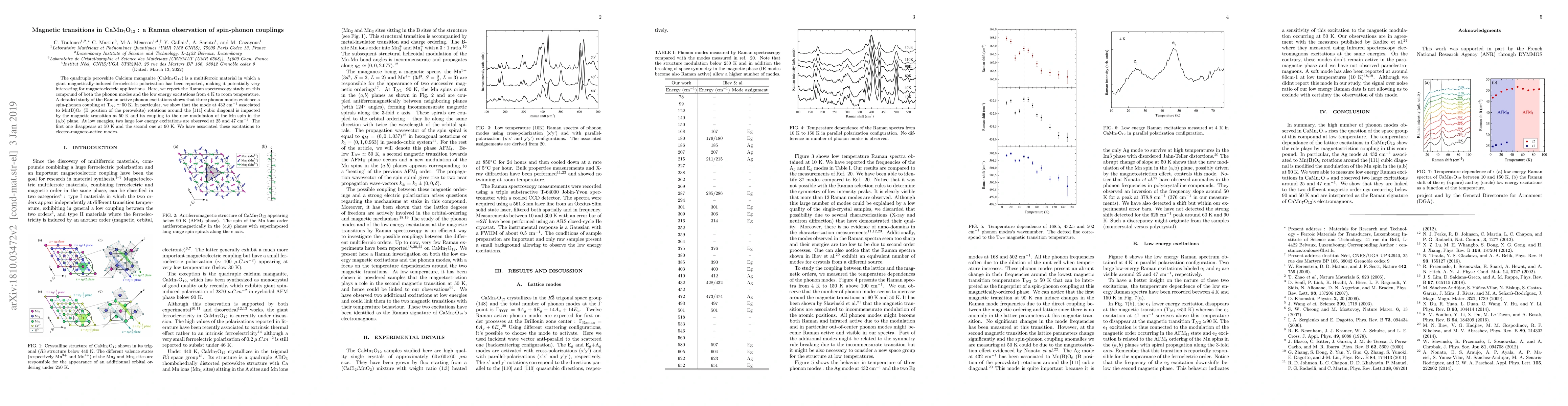 The quadruple Calcium manganite (CaMn7O12) is a multiferroic material that exhibits a giant magnetically-induced ferroelectric polarization which makes it very interesting for magnetoelectric applications. Here, we report the Raman spectroscopy study on this compound of both the phonon modes and the low energy excitations from 4 K to room temperature. A detailed study of the Raman active phonon excitations shows that three phonon modes evidence a spin-phonon coupling at TN2 = 50 K. In particular, we show that the mode at 432 cm-1 associated to Mn(B)O6 (B position of the perovskite) rotations around the [111] cubic diagonal is impacted by the magnetic transition at 50 K and its coupling to the new modulation of the Mn spin in the (a,b) plane. At low energies, two large low energy excitations are observed at 25 and 47 cm-1. The first one disappears at 50 K and the second one at 90 K. We have associated these excitations to electro-magneto-active modes.