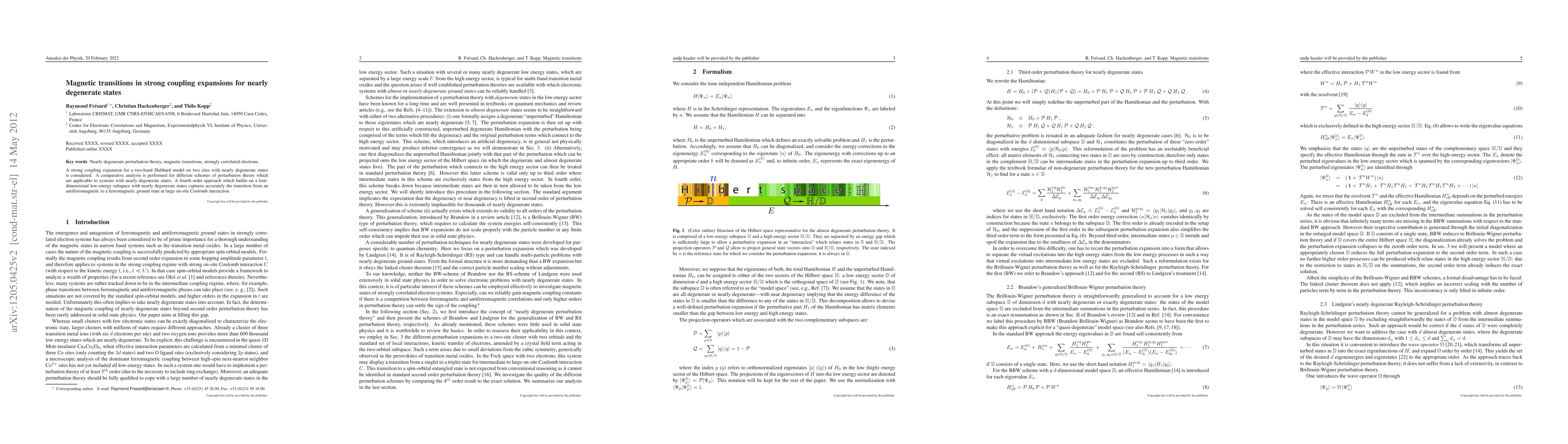 This paper investigates strong coupling expansions for a two-band Hubbard model on two sites with nearly degenerate states, employing various perturbation theory schemes. A fourth-order approach focusing on a four-dimensional low-energy subspace accurately captures the transition from antiferromagnetic to ferromagnetic ground states at strong on-site Coulomb interactions.