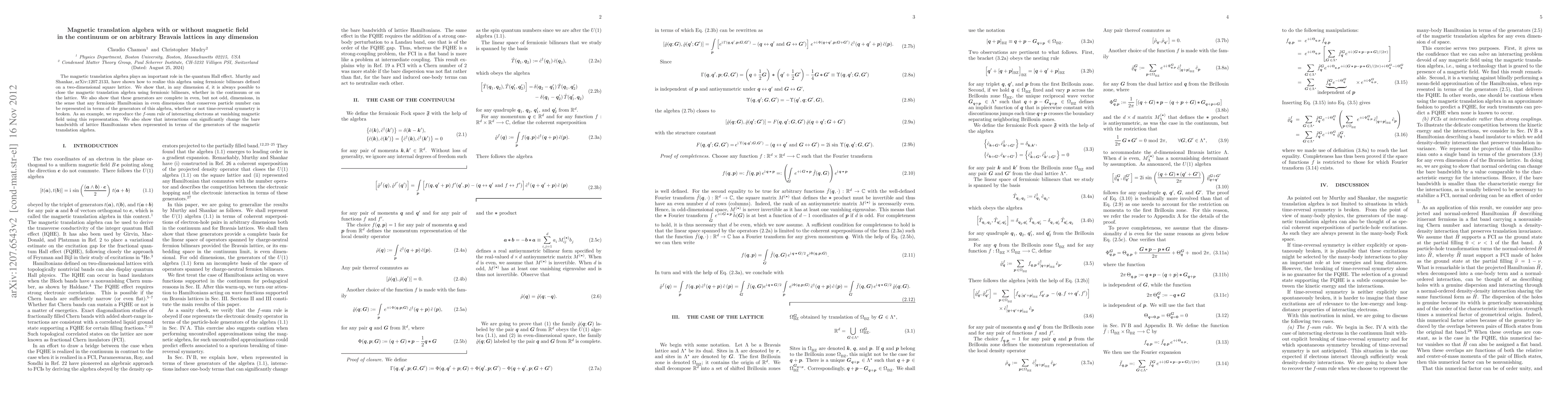 The magnetic translation algebra plays an important role in the quantum Hall effect. Murthy and Shankar, arXiv:1207.2133, have shown how to realize this algebra using fermionic bilinears defined on a two-dimensional square lattice. We show that, in any dimension $d$, it is always possible to close the magnetic translation algebra using fermionic bilinears, whether in the continuum or on the lattice. We also show that these generators are complete in even, but not odd, dimensions, in the sense that any fermionic Hamiltonian in even dimensions that conserves particle number can be represented in terms of the generators of this algebra, whether or not time-reversal symmetry is broken. As an example, we reproduce the $f$-sum rule of interacting electrons at vanishing magnetic field using this representation. We also show that interactions can significantly change the bare bandwidth of lattice Hamiltonians when represented in terms of the generators of the magnetic translation algebra.