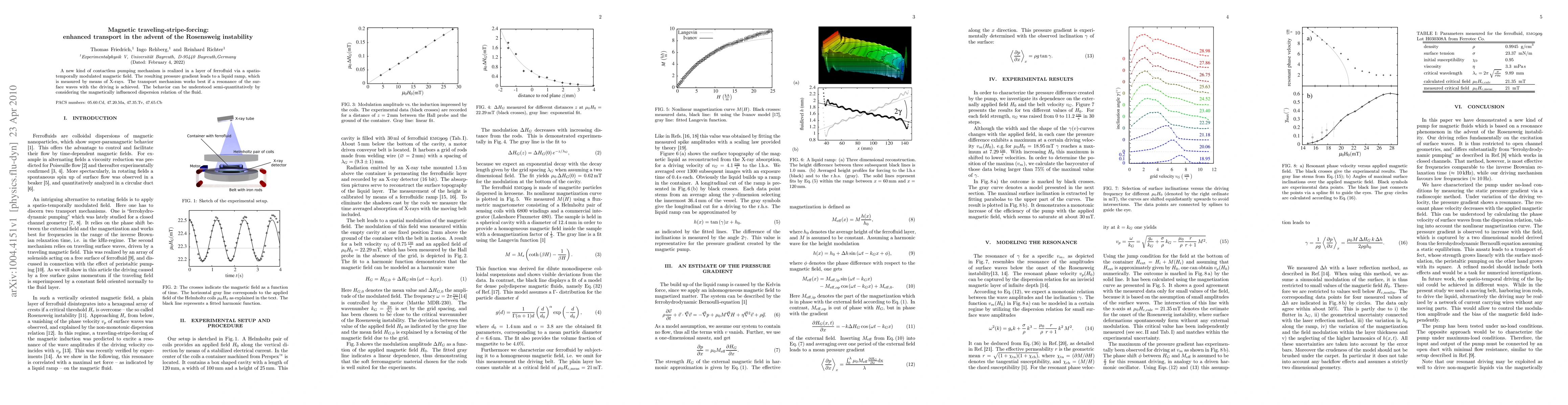 A new kind of contactless pumping mechanism is realized in a layer of ferrofluid via a spatio-temporally modulated magnetic field. The resulting pressure gradient leads to a liquid ramp, which is measured by means of X-rays. The transport mechanism works best if a resonance of the surface waves with the driving is achieved. The behavior can be understood semi-quantitatively by considering the magnetically influenced dispersion relation of the fluid.
