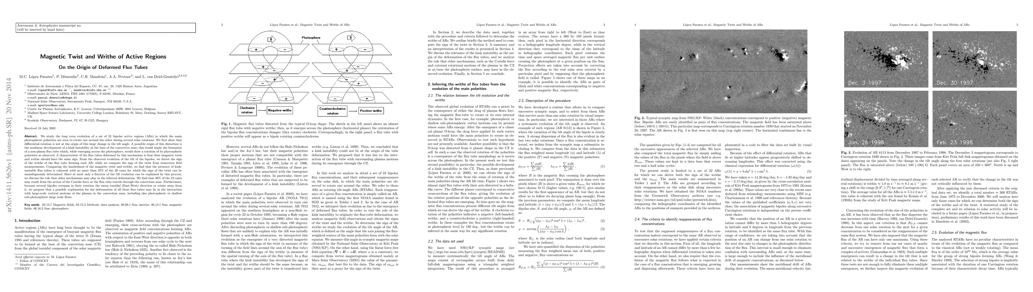 We study the long term evolution of a set of 22 bipolar active regions (ARs) in which the main photospheric polarities are seen to rotate one around the other during several solar rotations. We first show that differential rotation is not at the origin of this large change in the tilt angle. A possible origin of this distortion is the nonlinear development of a kink-instability at the base of the convective zone; this would imply the formation of a non-planar flux tube which, while emerging across the photosphere, would show a rotation of its photospheric polarities as observed. A characteristic of the flux tubes deformed by this mechanism is that their magnetic twist and writhe should have the same sign. From the observed evolution of the tilt of the bipoles, we derive the sign of the writhe of the flux tube forming each AR; while we compute the sign of the twist from transverse field measurements. Comparing the handedness of the magnetic twist and writhe, we find that the presence of kink-unstable flux tubes is coherent with no more than 35\% of the 20 cases for which the sign of the twist can be unambiguously determined. Since at most only a fraction of the tilt evolution can be explained by this process, we discuss the role that other mechanisms may play in the inferred deformation. We find that 36\% of the 22 cases may result from the action of the Coriolis force as the flux tube travels through the convection zone. Furthermore, because several bipoles overpass in their rotation the mean toroidal (East-West) direction or rotate away from it, we propose that a possible explanation for the deformation of all these flux tubes may lie in the interaction with large-scale vortical motions of the plasma in the convection zone, including also photospheric or shallow sub-photospheric large scale flows.