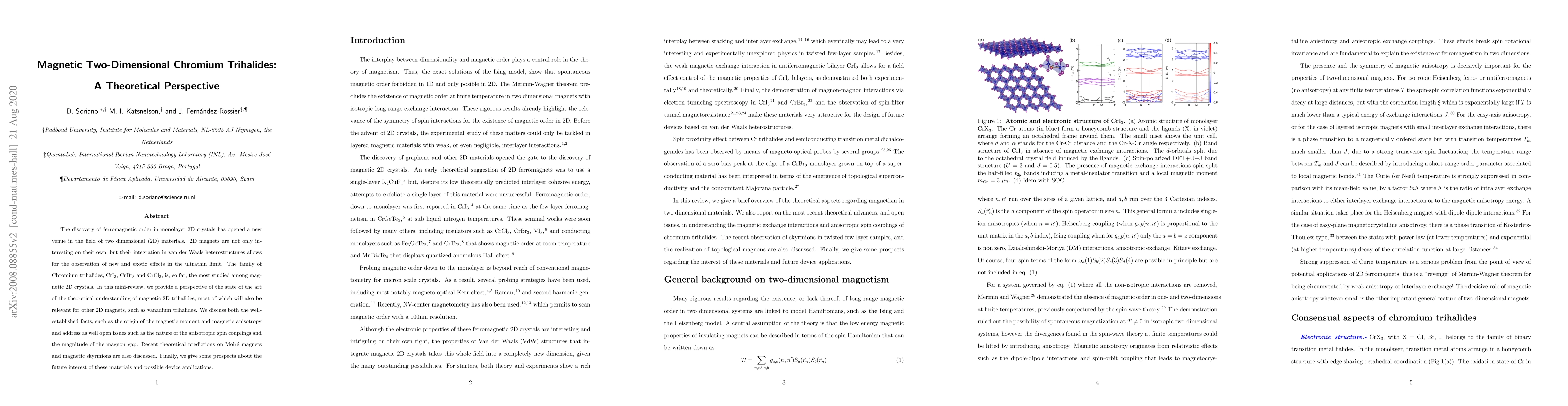 This paper reviews the theoretical understanding of magnetic two-dimensional chromium trihalides, focusing on their ferromagnetic properties and potential integration in van der Waals heterostructures. It discusses established facts and open issues, including spin couplings and magnon gaps, and explores future applications and device possibilities.