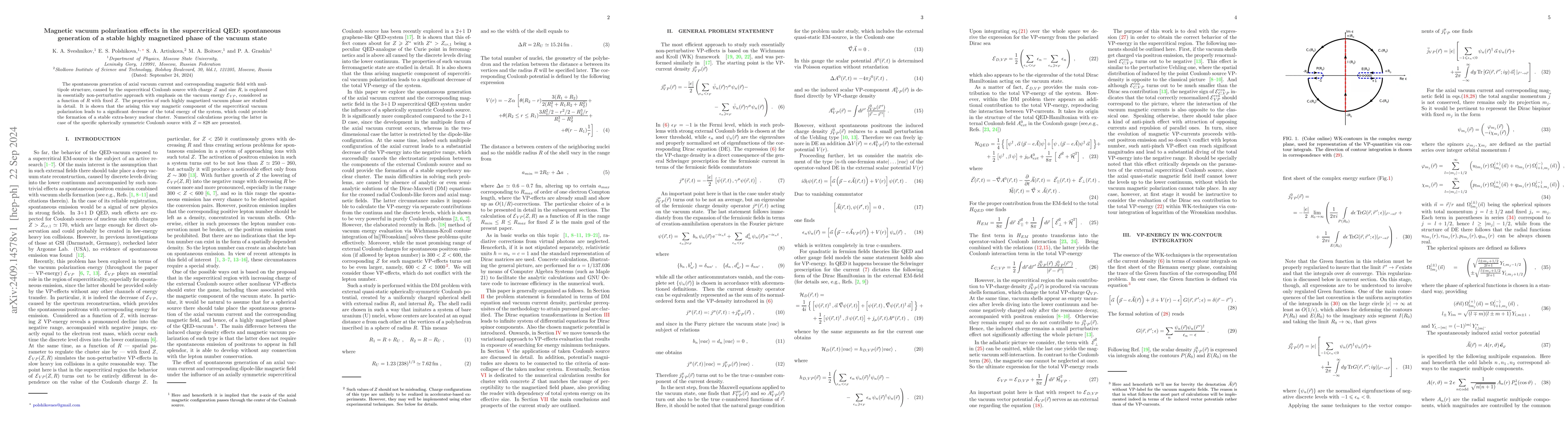 This research investigates the spontaneous generation of an axial vacuum current and magnetic field in supercritical QED due to a large Coulomb source, leading to a stable highly magnetized vacuum state. The study demonstrates that this magnetic component reduces the vacuum energy, potentially forming stable extra-heavy nuclear clusters, as shown by numerical calculations for a specific Coulomb source with charge $Z = 828$.