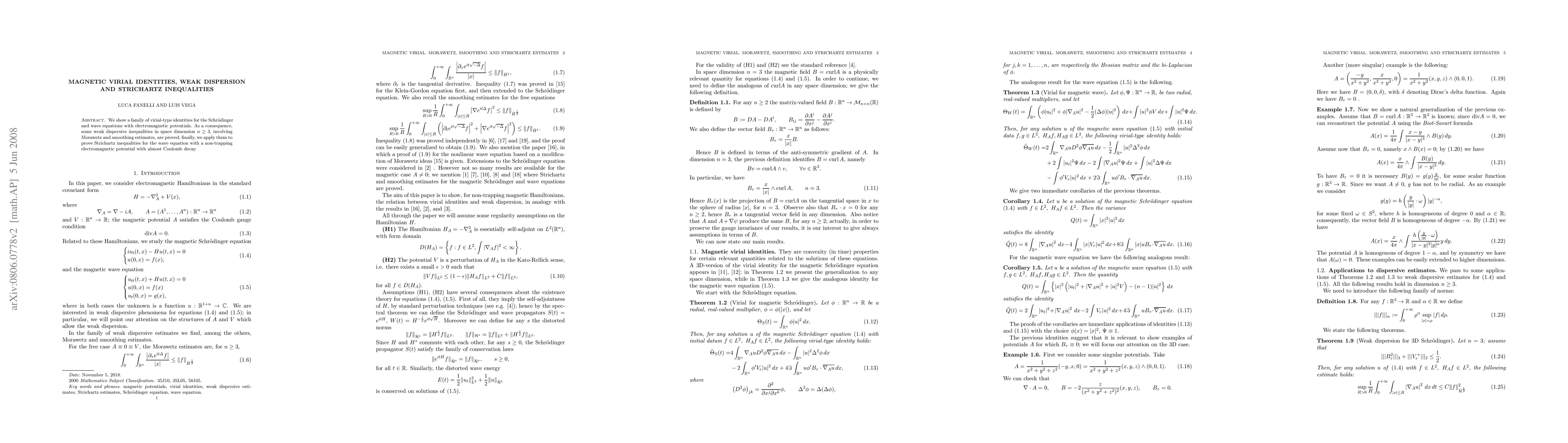 We show a family of virial-type identities for the Schr\"odinger and wave equations with electromagnetic potentials. As a consequence, some weak dispersive inequalities in space dimension $n\geq3$, involving Morawetz and smoothing estimates, are proved; finally, we apply them to prove Strichartz inequalities for the wave equation with a non-trapping electromagnetic potential with almost Coulomb decay.