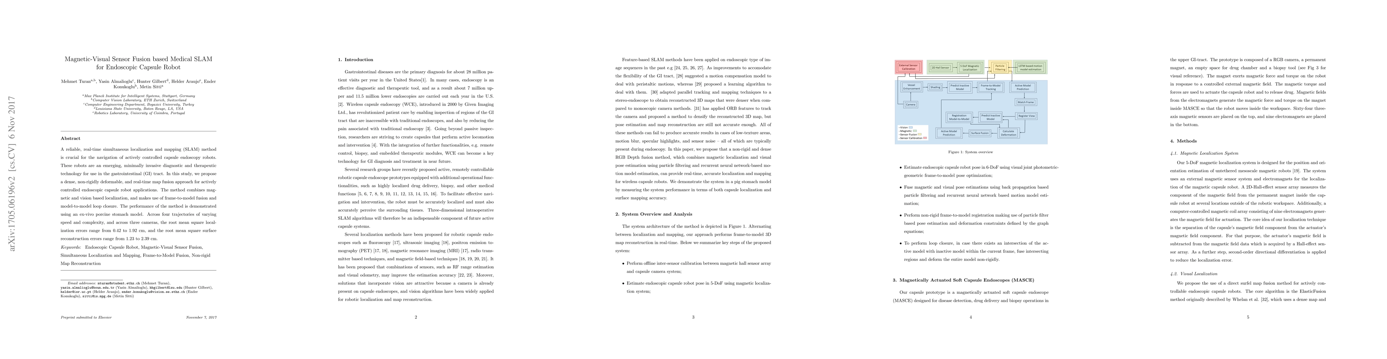 This paper proposes a SLAM method for endoscopic capsule robots that fuses magnetic and visual data for real-time navigation in the GI tract. The method achieves accurate localization and surface reconstruction with RMS errors ranging from 0.42 to 1.92 cm, validated on ex-vivo porcine stomach models.