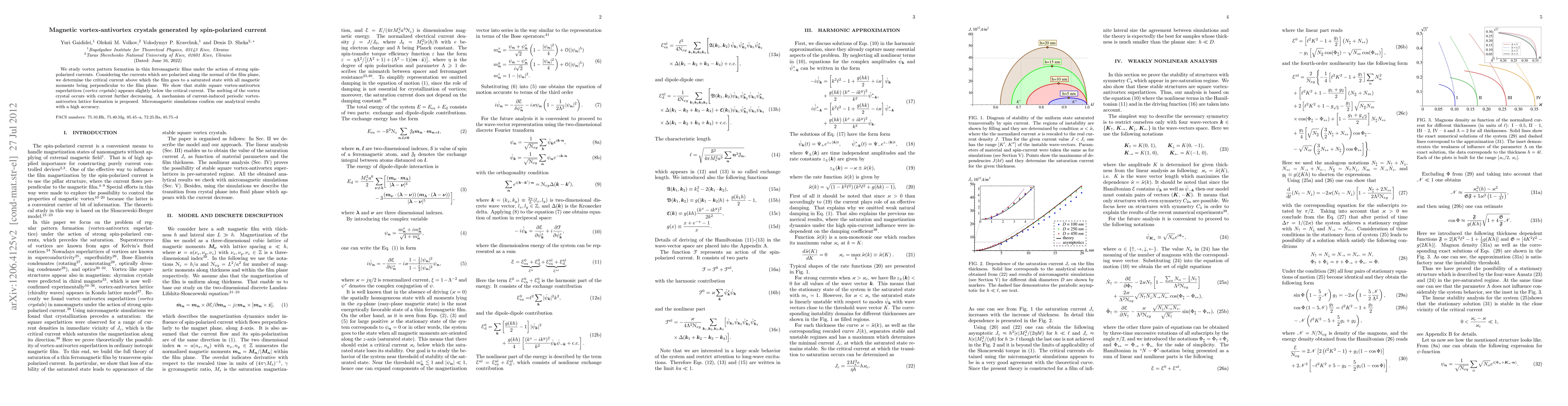 This paper investigates the formation of stable square vortex-antivortex superlattices in thin ferromagnetic films under strong spin-polarized currents, revealing a mechanism for current-induced periodic vortex lattice formation, confirmed by micromagnetic simulations. The study identifies the critical current for transitioning to a saturated state and the conditions for vortex crystal melting.
