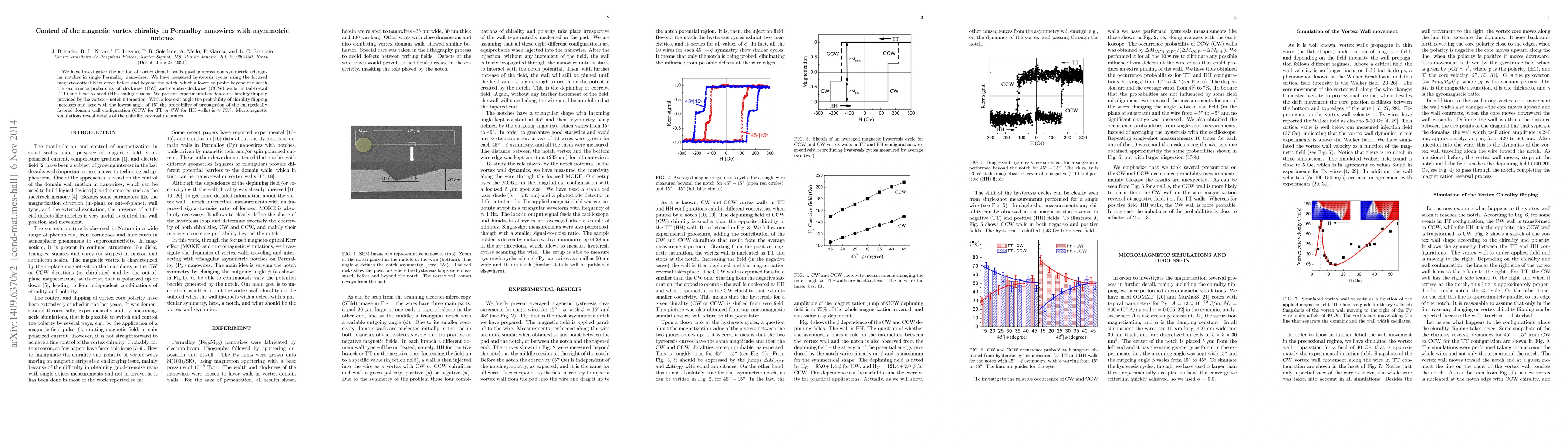 We have investigated the motion of vortex domain walls passing across non symmetric triangular notches in single Permalloy nanowires. We have measured hysteresis cycles using the focused magneto-optical Kerr effect before and beyond the notch, which allowed to probe beyond the notch the occurrence probability of clockwise (CW) and counter-clockwise (CCW) walls in tail-to-tail (TT) and head-to-head (HH) configurations. We present experimental evidence of chirality flipping provided by the vortex -- notch interaction. With a low exit angle the probability of chirality flipping increases and here with the lowest angle of 15$^o$ the probability of propagation of the energetically favored domain wall configuration (CCW for TT or CW for HH walls) is $\approx 75\%$. Micromagnetic simulations reveal details of the chirality reversal dynamics.