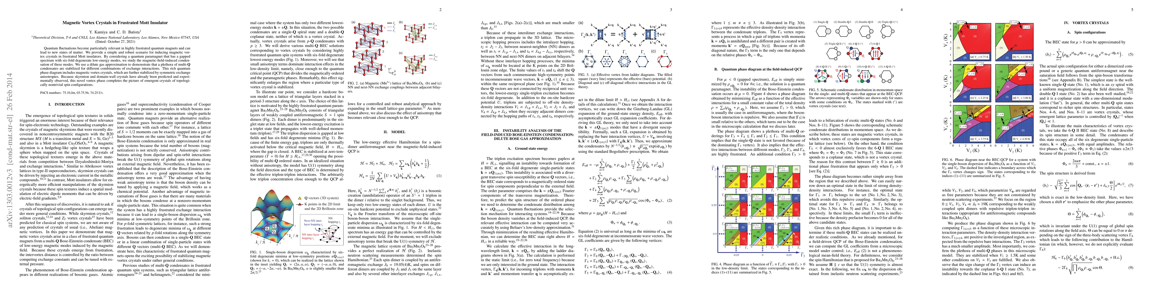 Quantum fluctuations become particularly relevant in highly frustrated quantum magnets and can lead to new states of matter. We provide a simple and robust scenario for inducing magnetic vortex crystals in frustrated Mott insulators. By considering a quantum paramagnet that has a gapped spectrum with six-fold degenerate low energy modes, we study the magnetic field induced condensation of these modes. We use a dilute gas approximation to demonstrate that a plethora of multi-$\mathbf{Q}$ condensates are stabilized for different combinations of exchange interactions. This rich quantum phase diagram includes magnetic vortex crystals, which are further stabilized by symmetric exchange anisotropies. Because magnetic skyrmion and domain wall crystals have already been predicted and experimentally observed, this novel vortex phase completes the picture of emergent crystals of topologically nontrivial spin configurations.