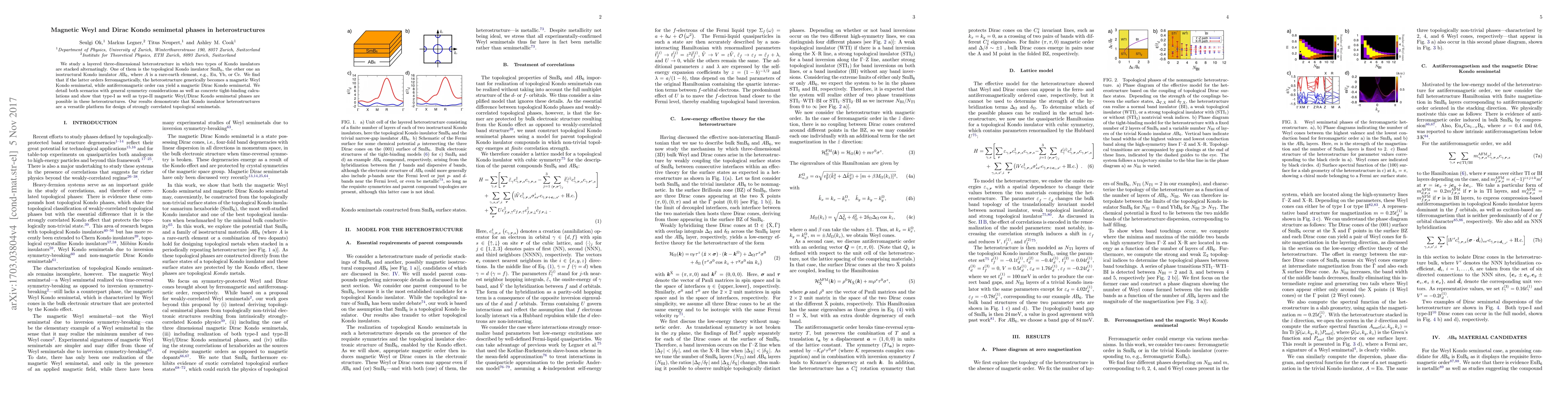 We study a layered three-dimensional heterostructure in which two types of Kondo insulators are stacked alternatingly. One of them is the topological Kondo insulator SmB 6 , the other one an isostructural Kondo insulator AB 6 , where A is a rare-earth element, e.g., Eu, Yb, or Ce. We find that if the latter orders ferromagnetically, the heterostructure generically becomes a magnetic Weyl Kondo semimetal, while antiferromagnetic order can yield a magnetic Dirac Kondo semimetal. We detail both scenarios with general symmetry considerations as well as concrete tight-binding calcu-lations and show that type-I as well as type-II magnetic Weyl/Dirac Kondo semimetal phases are possible in these heterostructures. Our results demonstrate that Kondo insulator heterostructures are a versatile platform for design of strongly correlated topological semimetals.