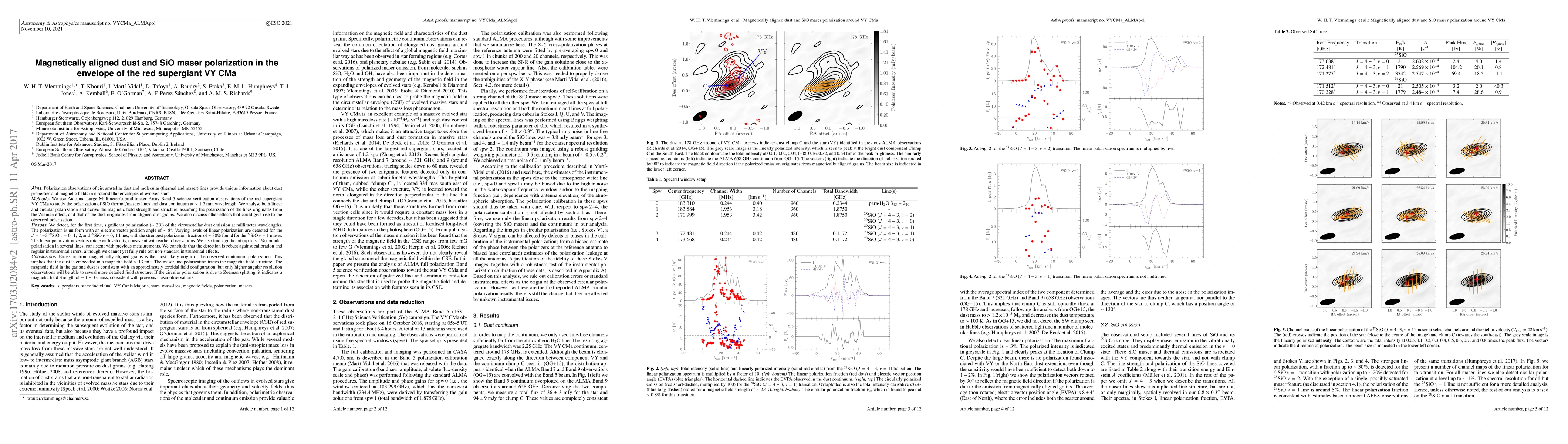 This study uses ALMA observations to analyze the polarization of SiO maser lines and dust continuum in the red supergiant VY CMa, revealing significant magnetic field alignment and structure. The findings include the first detection of ~3% polarization in circumstellar dust emission, indicating a magnetic field >13 mG.