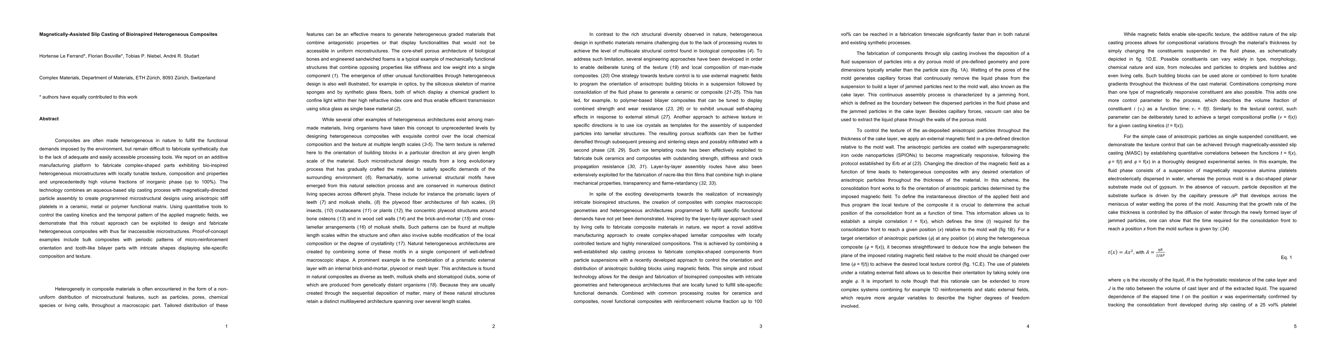 Composites are often made heterogeneous in nature to fulfill the functional demands imposed by the environment, but remain difficult to fabricate synthetically due to the lack of adequate and easily accessible processing tools. We report on an additive manufacturing platform to fabricate complex-shaped parts exhibiting bio-inspired heterogeneous microstructures with locally tunable texture, composition and properties and unprecedentedly high volume fractions of inorganic phase (up to 100%). The technology combines an aqueous-based slip casting process with magnetically-directed particle assembly to create programmed microstructural designs using anisotropic stiff platelets in a ceramic, metal or polymer functional matrix. Using quantitative tools to control the casting kinetics and the temporal pattern of the applied magnetic fields, we demonstrate that this robust approach can be exploited to design and fabricate heterogeneous composites with thus far inaccessible microstructures. Proof-of-concept examples include bulk composites with periodic patterns of micro-reinforcement orientation and tooth-like bilayer parts with intricate shapes displaying site-specific composition and texture.