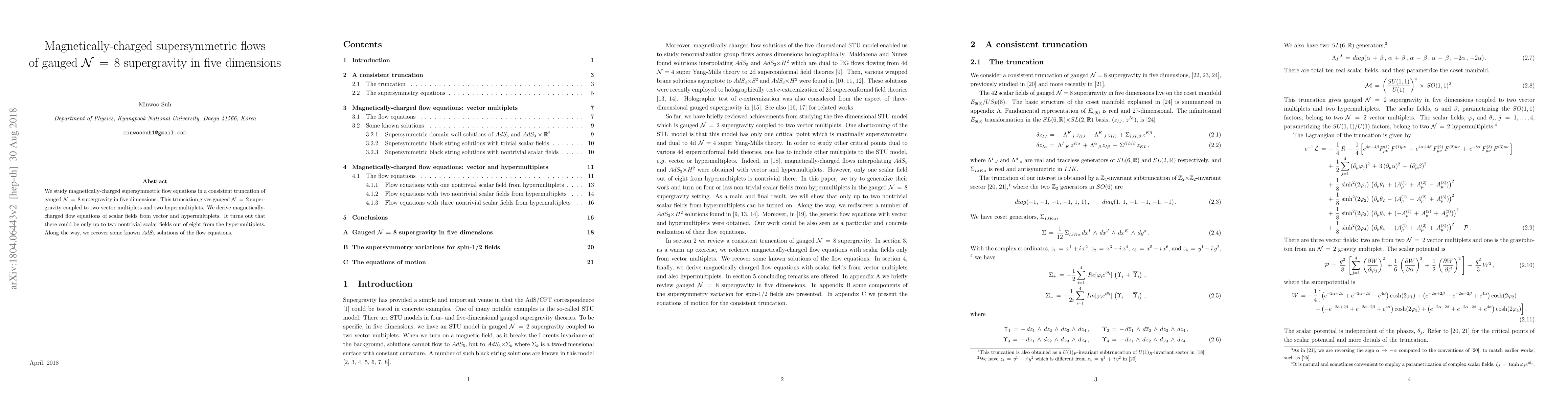 We study magnetically-charged supersymmetric flow equations in a consistent truncation of gauged $\mathcal{N}\,=\,8$ supergravity in five dimensions. This truncation gives gauged $\mathcal{N}\,=\,2$ supergravity coupled to two vector multiplets and two hypermultiplets. We derive magnetically-charged flow equations of scalar fields from vector and hypermultiplets. It turns out that there could be only up to two nontrivial scalar fields out of eight from the hypermultiplets. Along the way, we recover some known $AdS_3$ solutions of the flow equations.