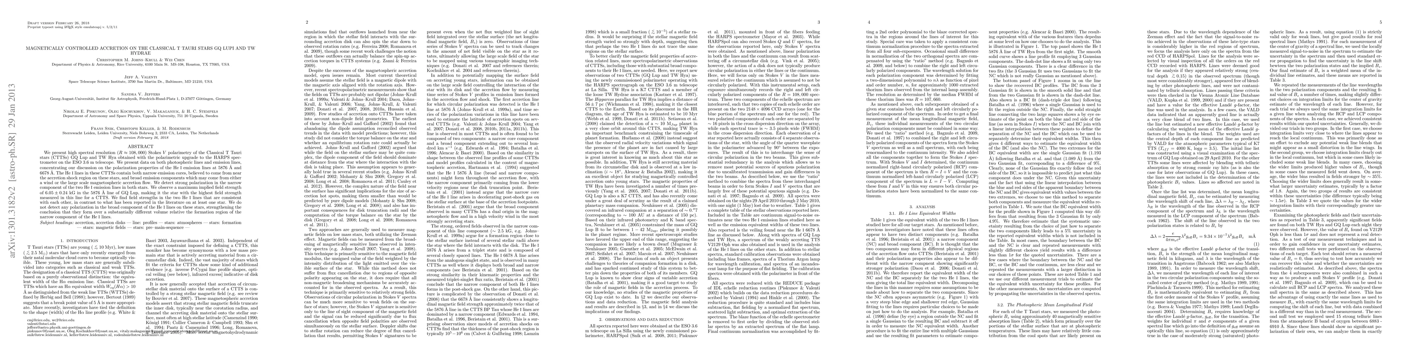 We present high spectral resolution ($R\approx108,000$) Stokes $V$ polarimetry of the Classical T Tauri stars (CTTSs) GQ Lup and TW Hya obtained with the polarimetric upgrade to the HARPS spectrometer on the ESO 3.6 m telescope. We present data on both photospheric lines and emission lines, concentrating our discussion on the polarization properties of the \ion{He}{1} emission lines at 5876 \AA\ and 6678 \AA. The \ion{He}{1} lines in these CTTSs contain both narrow emission cores, believed to come from near the accretion shock region on these stars, and broad emission components which may come from either a wind or the large scale magnetospheric accretion flow. We detect strong polarization in the narrow component of the two \ion{He}{1} emission lines in both stars. We observe a maximum implied field strength of $6.05 \pm 0.24$ kG in the 5876 \AA\ line of GQ Lup, making it the star with the highest field strength measured in this line for a CTTS. We find field strengths in the two \ion{He}{1} lines that are consistent with each other, in contrast to what has been reported in the literature on at least one star. We do not detect any polarization in the broad component of the \ion{He}{1} lines on these stars, strengthening the conclusion that they form over a substantially different volume relative the formation region of the narrow component of the \ion{He}{1} lines.