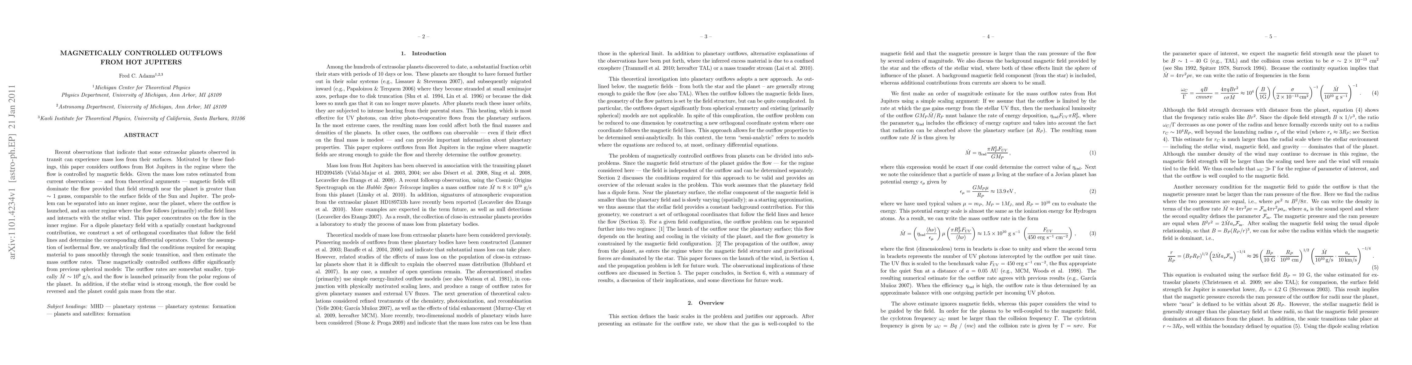 Recent observations that indicate that some extrasolar planets observed in transit can experience mass loss from their surfaces. Motivated by these findings, this paper considers outflows from Hot Jupiters in the regime where the flow is controlled by magnetic fields. Given the mass loss rates estimated from current observations --- and from theoretical arguments --- magnetic fields will dominate the flow provided that field strength near the planet is greater than $\sim1$ gauss, comparable to the surface fields of the Sun and Jupiter. The problem can be separated into an inner regime, near the planet, where the outflow is launched, and an outer regime where the flow follows (primarily) stellar field lines and interacts with the stellar wind. This paper concentrates on the flow in the inner regime. For a dipole planetary field with a spatially constant background contribution, we construct a set of orthogonal coordinates that follow the field lines and determine the corresponding differential operators. Under the assumption of isothermal flow, we analytically find the conditions required for escaping material to pass smoothly through the sonic transition, and then estimate the mass outflow rates. These magnetically controlled outflows differ significantly from previous spherical models: The outflow rates are somewhat smaller, typically ${\dot M}$ $\sim 10^{9}$ g/s, and the flow is launched primarily from the polar regions of the planet. In addition, if the stellar wind is strong enough, the flow could be reversed and the planet could gain mass from the star.