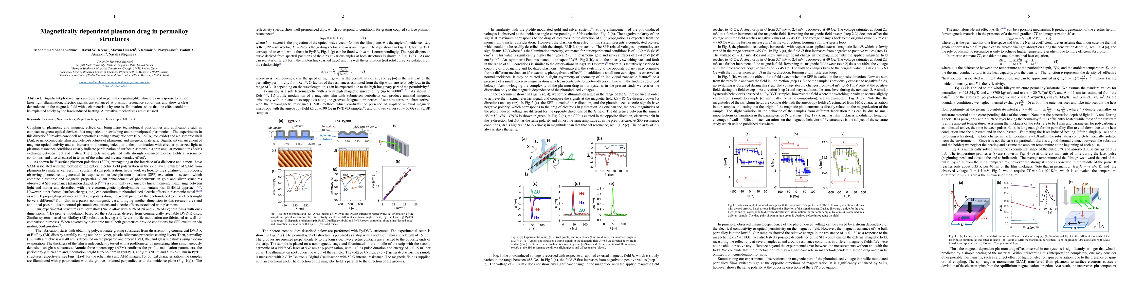 This study reveals significant photovoltages in permalloy structures under pulsed laser illumination, with enhanced electric signals at plasmon resonance showing magnetic field dependence and hysteresis. The observed effect cannot be attributed to laser-induced heating alone, suggesting alternative mechanisms.