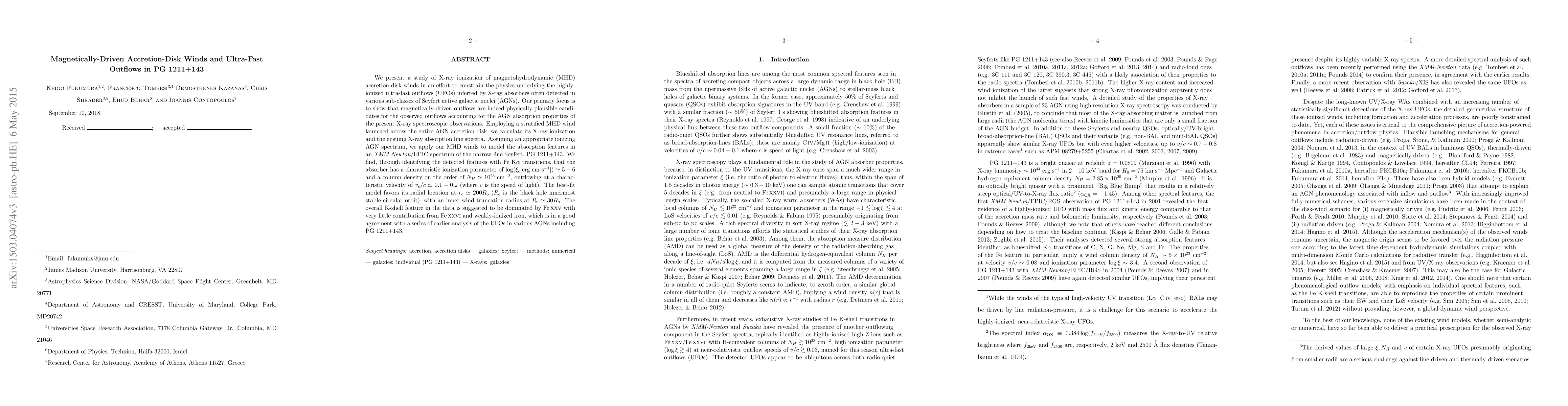 This study investigates the X-ray ionization of magnetically-driven magnetohydrodynamic accretion-disk winds in PG1211+143, aiming to model the ultra-fast outflows (UFOs) observed in active galactic nuclei. The analysis suggests these magnetically-driven winds are plausible candidates for the observed AGN absorption, with an ionization parameter of $\log (\xi_c [erg~cm~s^{-1}]) \simeq 5-6$ and a column density of $N_H \simeq 10^{23}$ cm$^{-2}$.
