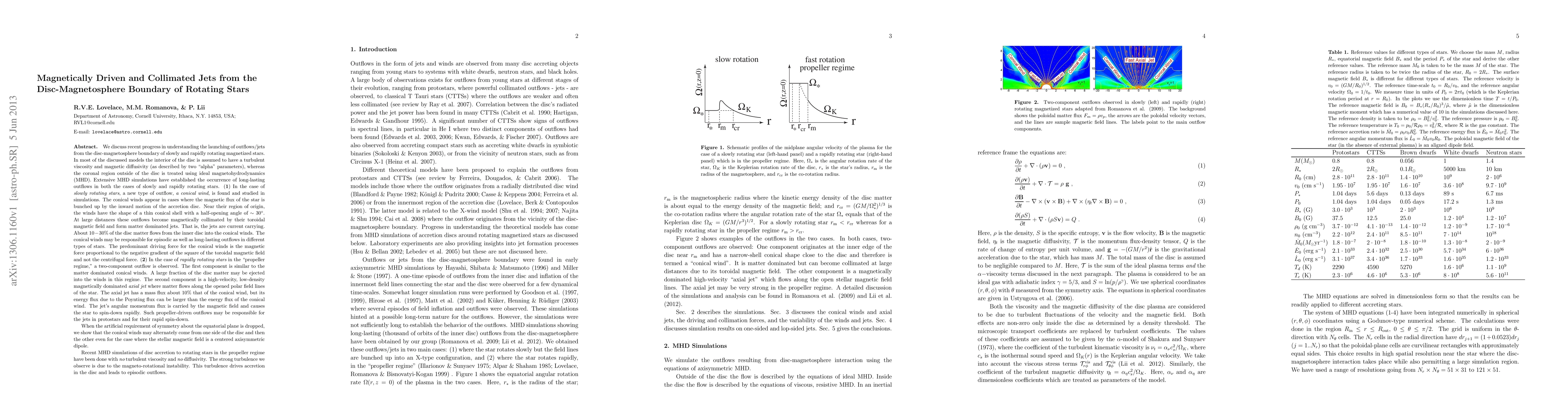 We discuss recent progress in understanding the launching of outflows/jets from the disc-magnetosphere boundary of slowly and rapidly rotating magnetized stars. In most of the discussed models the interior of the disc is assumed to have a turbulent viscosity and magnetic diffusivity (as described by two ``alpha'' parameters), whereas the coronal region outside of the disc is treated using ideal magnetohydrodynamics (MHD). Extensive MHD simulations have established the occurrence of long-lasting outflows in both the cases of slowly and rapidly rotating stars. In the case of {\it slowly rotating stars}, a new type of outflow, {\it a conical wind}, is found and studied in simulations. The conical winds appear in cases where the magnetic flux of the star is bunched up by the inward motion of the accretion disc. Near their region of origin, the winds have the shape of a thin conical shell with a half-opening angle of $ \sim 30^\circ$. At large distances these outflows become magnetically collimated by their toroidal magnetic field and form matter dominated jets. That is, the jets are current carrying. The predominant driving force for the conical winds is the magnetic force proportional to the negative gradient of the square of the toroidal magnetic field and not the centrifugal force. In the case of {\it rapidly rotating stars} in the ``propeller regime,'' a two-component outflow is observed. The first component is similar to the matter dominated conical winds. A large fraction of the disc matter may be ejected into the winds in this regime. The second component is a high-velocity, low-density magnetically dominated {\it axial jet} where matter flows along the opened polar field lines of the star.