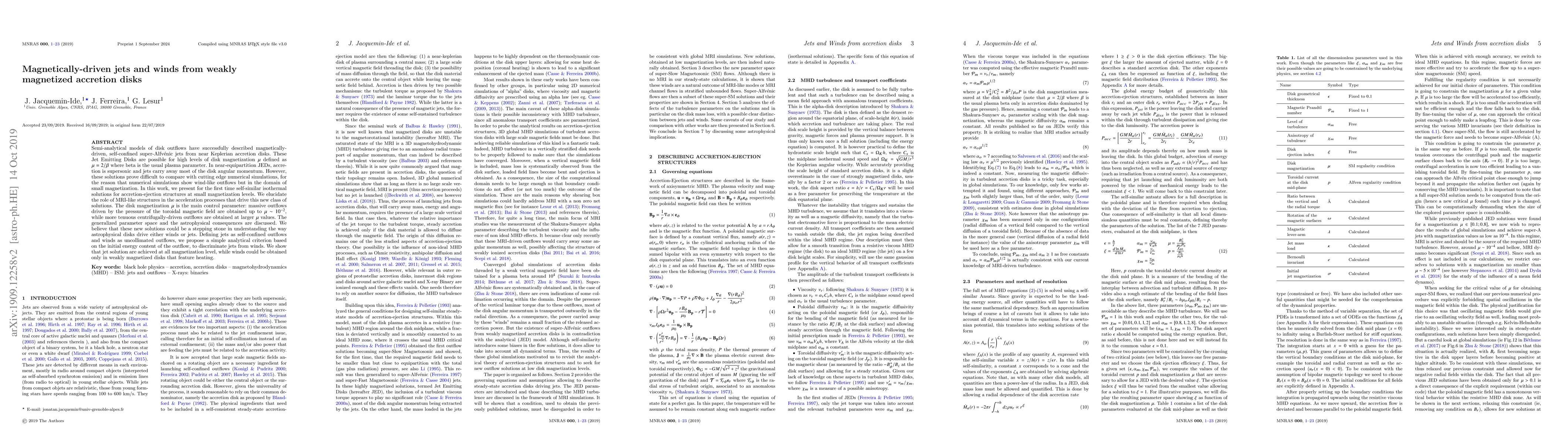 Semi-analytical models of disk outflows have successfully described magnetically-driven, self-confined super-Alfv\'enic jets from near Keplerian accretion disks. These Jet Emitting Disks are possible for high levels of disk magnetization $\mu$ defined as $\mu=2/\beta$ where beta is the usual plasma parameter. In near-equipartition JEDs, accretion is supersonic and jets carry away most of the disk angular momentum. However, these solutions prove difficult to compare with cutting edge numerical simulations, for the reason that numerical simulations show wind-like outflows but in the domain of small magnetization. In this work, we present for the first time self-similar isothermal solutions for accretion-ejection structures at small magnetization levels. We elucidate the role of MRI-like structures in the acceleration processes that drive this new class of solutions. The disk magnetization $\mu$ is the main control parameter: massive outflows driven by the pressure of the toroidal magnetic field are obtained up to $\mu \sim 10^{-2}$, while more tenuous centrifugally-driven outflows are obtained at larger $\mu$ values. The generalized parameter space and the astrophysical consequences are discussed. We believe that these new solutions could be a stepping stone in understanding the way astrophysical disks drive either winds or jets. Defining jets as self-confined outflows and winds as uncollimated outflows, we propose a simple analytical criterion based on the initial energy content of the outflow, to discriminate jets from winds. We show that jet solution are achieved at all magnetization level, while winds could be obtained only in weakly magnetized disks that feature heating.