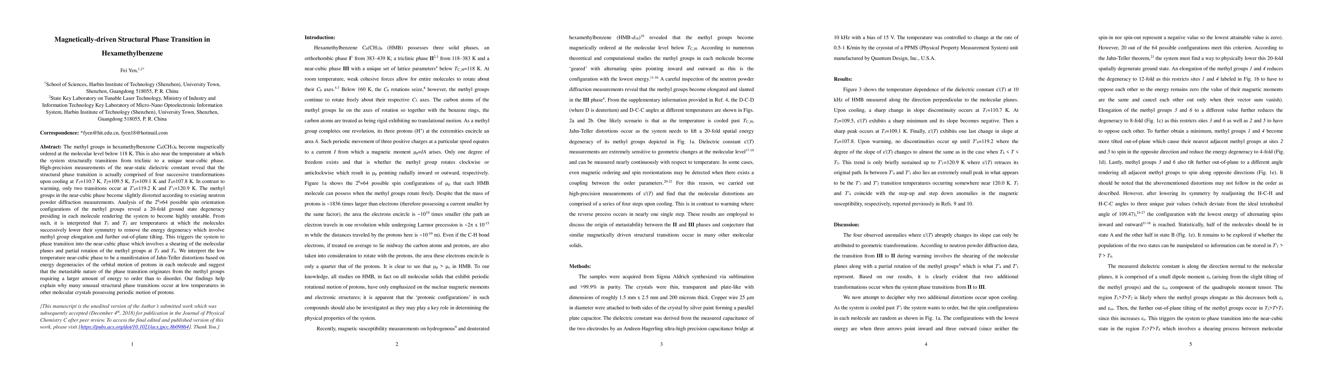 Hexamethylbenzene undergoes a magnetically-driven structural phase transition at low temperatures, with four successive transformations between 110.7 K and 107.8 K, involving the ordering of methyl groups and the formation of a near-cubic phase.