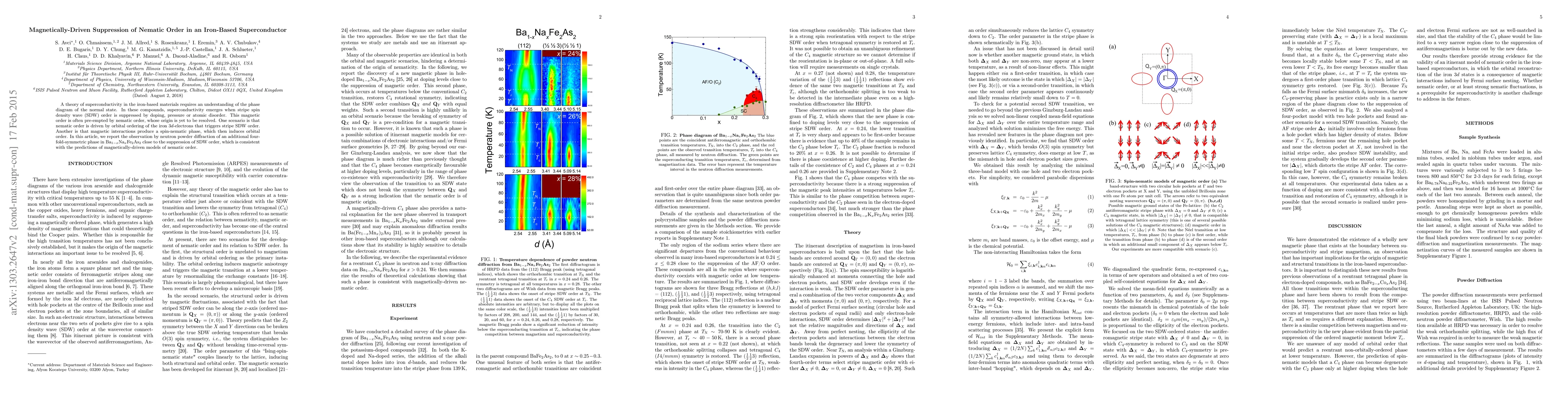 A theory of superconductivity in the iron-based materials requires an understanding of the phase diagram of the normal state. In these compounds, superconductivity emerges when stripe spin density wave (SDW) order is suppressed by doping, pressure or atomic disorder. This magnetic order is often pre-empted by nematic order, whose origin is yet to be resolved. One scenario is that nematic order is driven by orbital ordering of the iron 3d-electrons that triggers stripe SDW order. Another is that magnetic interactions produce a spin-nematic phase, which then induces orbital order. In this article, we report the observation by neutron powder diffraction of an additional four- fold-symmetric phase in Ba1-xNaxFe2As2 close to the suppression of SDW order, which is consistent with the predictions of magnetically-driven models of nematic order.