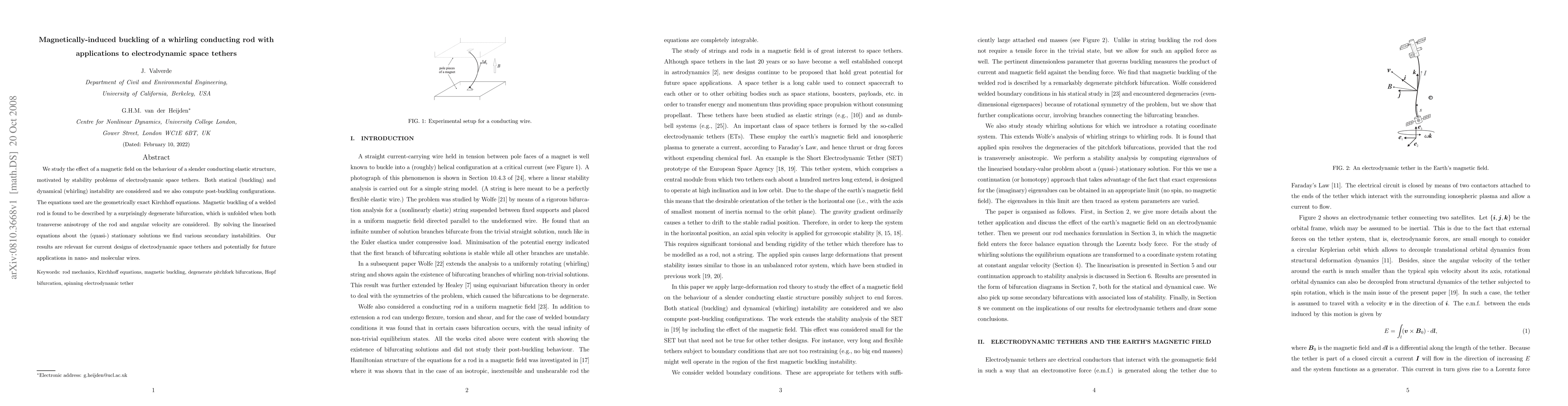 We study the effect of a magnetic field on the behaviour of a slender conducting elastic structure, motivated by stability problems of electrodynamic space tethers. Both statical (buckling) and dynamical (whirling) instability are considered and we also compute post-buckling configurations. The equations used are the geometrically exact Kirchhoff equations. Magnetic buckling of a welded rod is found to be described by a surprisingly degenerate bifurcation, which is unfolded when both transverse anisotropy of the rod and angular velocity are considered. By solving the linearised equations about the (quasi-) stationary solutions we find various secondary instabilities. Our results are relevant for current designs of electrodynamic space tethers and potentially for future applications in nano- and molecular wires.