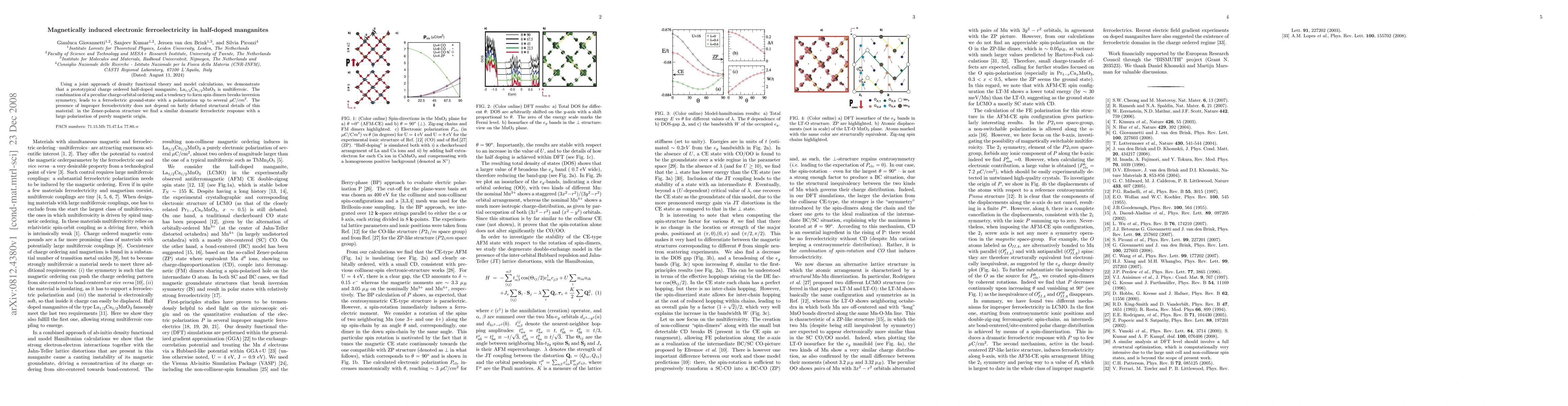 This study reveals that La$_{1/2}$Ca$_{1/2}$MnO$_3$ exhibits magnetically induced electronic ferroelectricity due to charge-orbital ordering and spin dimers, leading to a large polarization of magnetic origin, independent of structural specifics. The research combines density functional theory and model calculations to demonstrate its multiferroic nature.