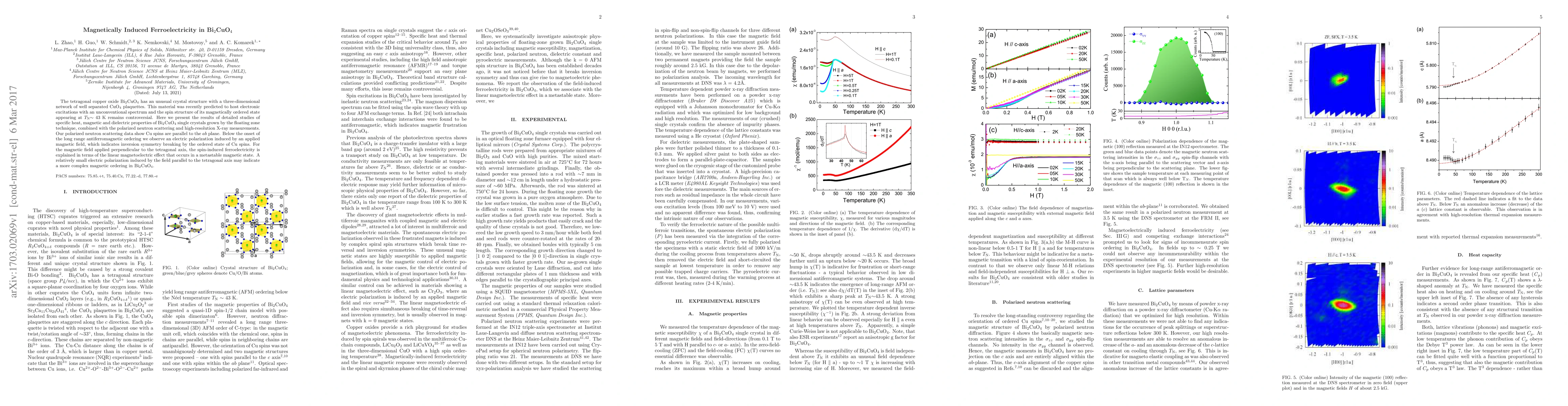 Bi$_2$CuO$_4$ exhibits ferroelectricity when exposed to a magnetic field due to the ordered state of its copper spins, indicating an unconventional spin structure.