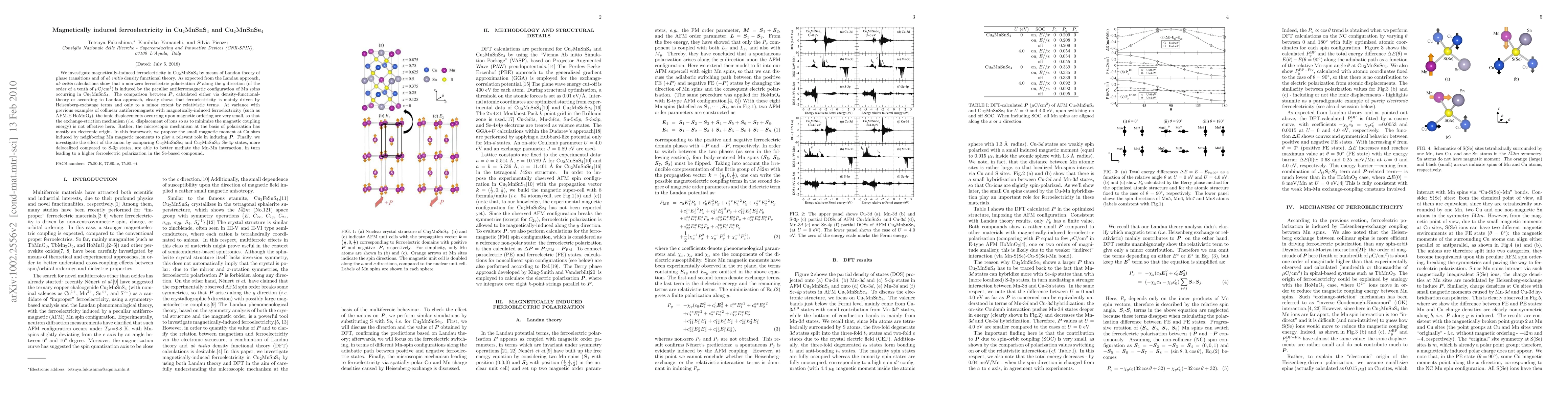 We investigate magnetically-induced ferroelectricity in Cu2MnSnS4 by means of Landau theory of phase transitions and of ab initio density functional theory. As expected from the Landau approach, ab initio calculations show that a non-zero ferroelectric polarization P along the y direction is induced by the peculiar antiferromagnetic configuration of Mn spins occurring in Cu2MnSnS4. The comparison between P, calculated either via density-functional-theory or according to Landau approach, clearly shows that ferroelectricity is mainly driven by Heisenberg-exchange terms and only to a minor extent by relativistic terms. At variance with previous examples of collinear antiferromagnets with magnetically-induced ferroelectricity (such as AFM-E HoMnO3), the ionic displacements occurring upon magnetic ordering are very small, so that the exchange-striction mechanism (i.e. displacement of ions so as to minimize the magnetic coupling energy) is not effective here. Rather, the microscopic mechanism at the basis of polarization has mostly an electronic origin. In this framework, we propose the small magnetic moment at Cu sites induced by neighboring Mn magnetic moments to play a relevant role in inducing P. Finally, we investigate the effect of the anion by comparing Cu2MnSnSe4 and Cu2MnSnS4: Se-4p states, more delocalized compared to S-3p states, are able to better mediate the Mn-Mn interaction, in turn leading to a higher ferroelectric polarization in the Se-based compound.