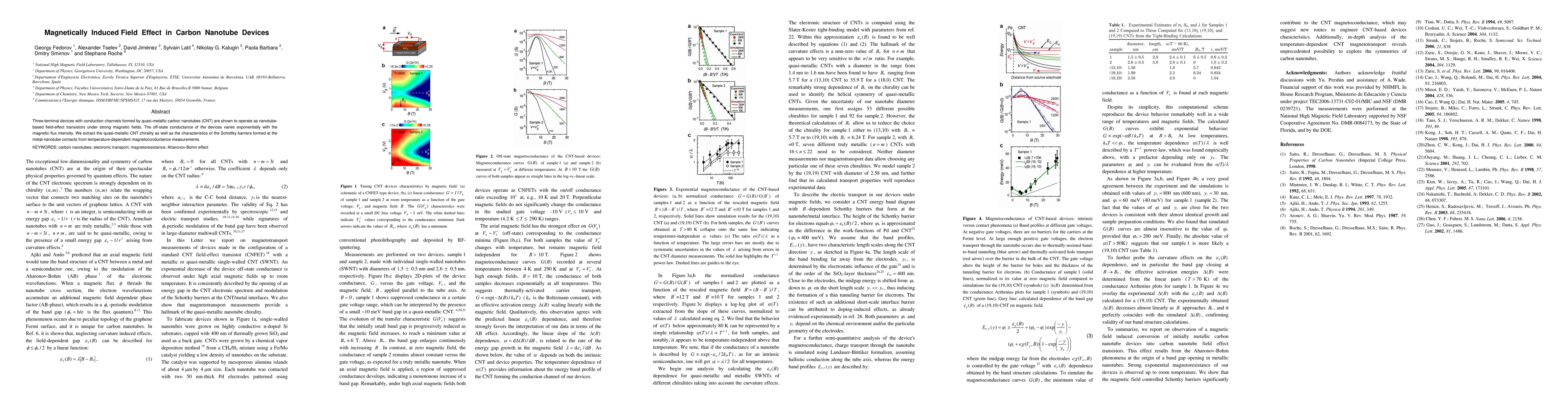 This research demonstrates that quasi-metallic carbon nanotubes in three-terminal devices function as field-effect transistors under strong magnetic fields, with off-state conductance varying exponentially with magnetic flux. The study extracts chirality details and Schottky barrier characteristics via temperature-dependent magnetoconductance measurements.