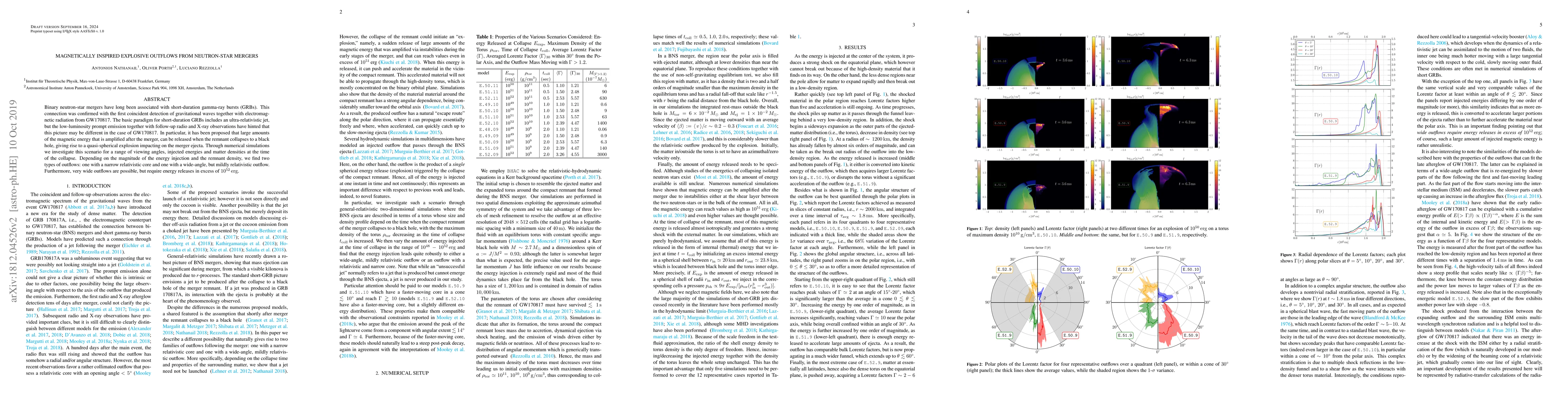 This paper explores the magnetically-driven explosive outflows from neutron-star mergers, proposing that amplified magnetic energy post-merger can lead to quasi-spherical explosions. Numerical simulations reveal two outflow types: narrow relativistic jets and wide-angle, mildly relativistic outflows, contingent on energy injection and remnant density.