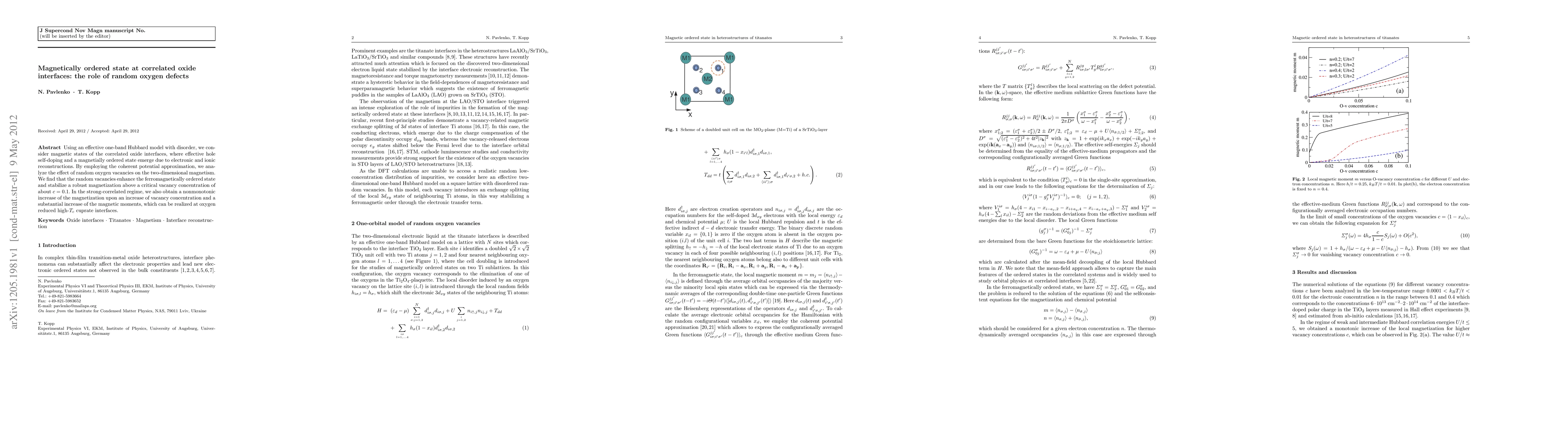 The research uses an effective one-band Hubbard model with disorder to analyze magnetic states at correlated oxide interfaces, employing the coherent potential approximation to study the effect of random oxygen vacancies on two-dimensional magnetism.