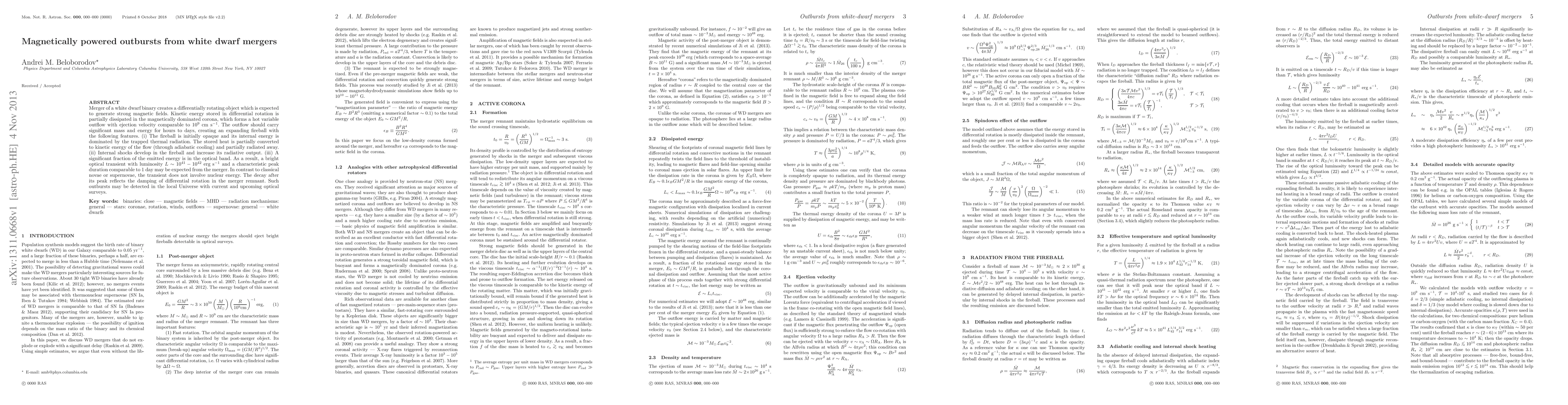 Merger of a white dwarf binary creates a differentially rotating object which is expected to generate strong magnetic fields. Kinetic energy stored in differential rotation is partially dissipated in the magnetically dominated corona, which forms a hot variable outflow with ejection velocity comparable to $10^9$ cm s$^{-1}$. The outflow should carry significant mass and energy for hours to days, creating an expanding fireball with the following features. (i) The fireball is initially opaque and its internal energy is dominated by the trapped thermal radiation. The stored heat is partially converted to kinetic energy of the flow (through adiabatic cooling) and partially radiated away. (ii) Internal shocks develop in the fireball and increase its radiative output. (iii) A significant fraction of the emitted energy is in the optical band. As a result, a bright optical transient with luminosity $L\sim 10^{41}-10^{42}$ erg s$^{-1}$ and a characteristic peak duration comparable to 1 day may be expected from the merger. In contrast to classical novae or supernovae, the transient does not involve nuclear energy. The decay after its peak reflects the damping of differential rotation in the merger remnant. Such outbursts may be detected in the local Universe with current and upcoming optical surveys.