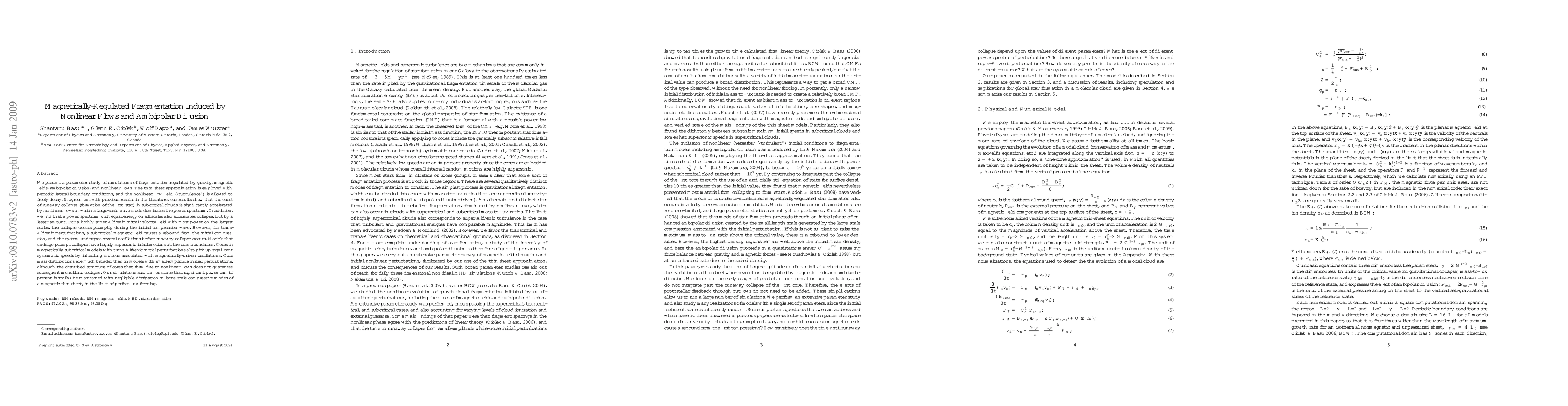 We present a parameter study of simulations of fragmentation regulated by gravity, magnetic fields, ambipolar diffusion, and nonlinear flows. The thin-sheet approximation is employed with periodic lateral boundary conditions, and the nonlinear flow field ("turbulence") is allowed to freely decay. In agreement with previous results in the literature, our results show that the onset of runaway collapse (formation of the first star) in subcritical clouds is significantly accelerated by nonlinear flows in which a large-scale wave mode dominates the power spectrum. In addition, we find that a power spectrum with equal energy on all scales also accelerates collapse, but by a lesser amount. For a highly super-Alfvenic initial velocity field with most power on the largest scales, the collapse occurs promptly during the initial compression wave. However, for trans-Alfvenic perturbations, a subcritical magnetic field causes a rebound from the initial compression, and the system undergoes several oscillations before runaway collapse occurs. Models that undergo prompt collapse have highly supersonic infall motions at the core boundaries. Cores in magnetically subcritical models with trans-Alfvenic initial perturbations also pick up significant systematic speeds by inheriting motions associated with magnetically-driven oscillations. Core mass distributions are much broader than in models with small-amplitude initial perturbations, although the disturbed structure of cores that form due to nonlinear flows does not guarantee subsequent monolithic collapse. Our simulations also demonstrate that significant power can (if present initially) be maintained with negligible dissipation in large-scale compressive modes of a magnetic thin sheet, in the limit of perfect flux freezing.