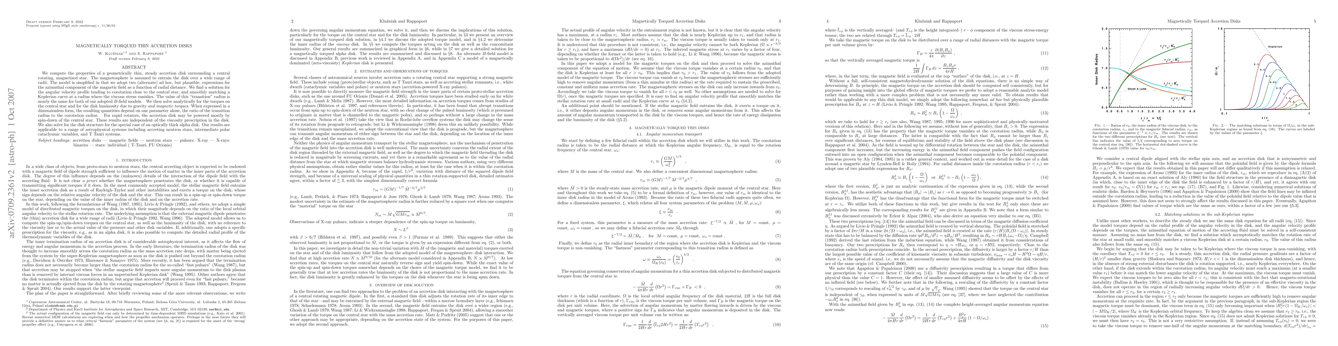 This research computes properties of thin accretion disks around magnetized, rotating stars, finding a consistent 'transition' radius linking corotation and Keplerian velocities. Torques on the central star and disk luminosity are analytically solved, dependent on one parameter. The findings apply to systems like accreting neutron stars and T Tauri systems, irrespective of disk viscosity.