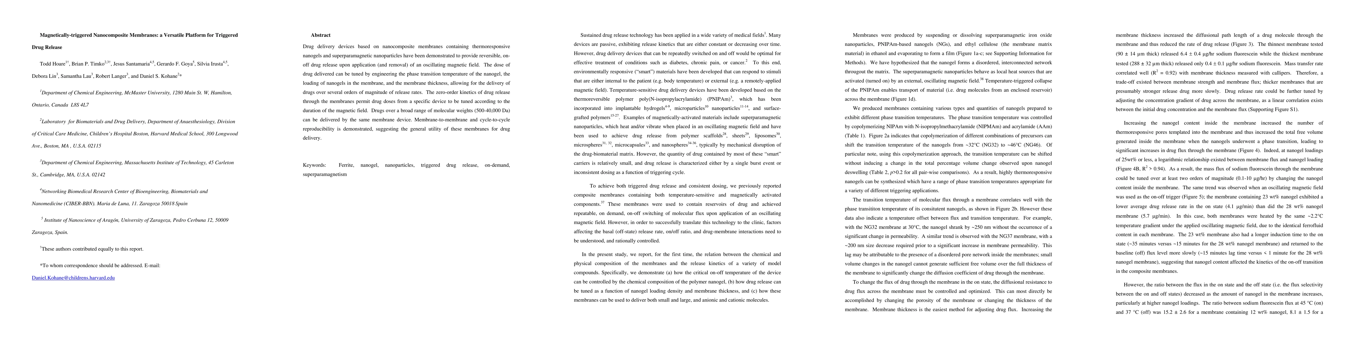 This paper presents magnetically-triggered nanocomposite membranes that enable reversible, tunable drug release via an oscillating magnetic field. The membranes' drug release kinetics can be precisely controlled by adjusting nanogel phase transition temperature, nanogel loading, and membrane thickness, allowing for broad drug delivery applications.