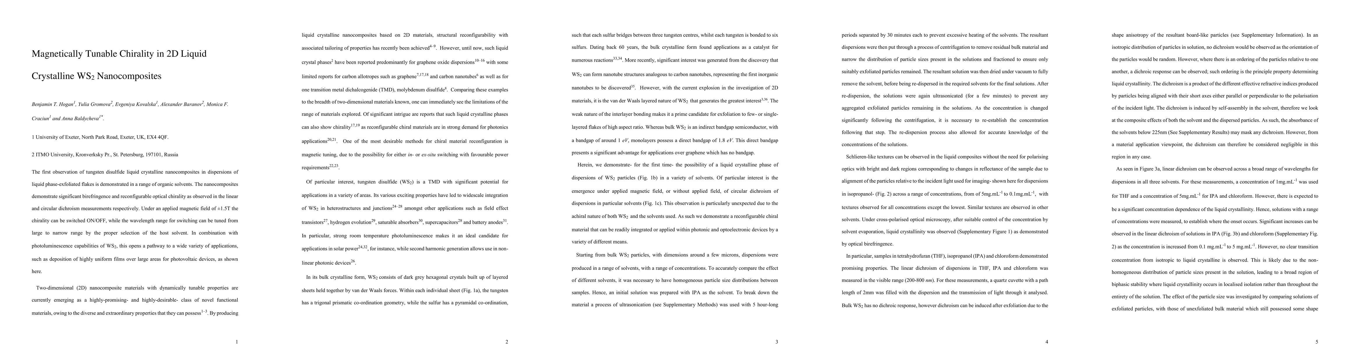 The first observation of tungsten disulfide liquid crystalline nanocomposites in dispersions of liquid phase-exfoliated flakes is demonstrated in a range of organic solvents. The nanocomposites demonstrate significant birefringence and reconfigurable optical chirality as observed in the linear and circular dichroism measurements respectively. Under an applied magnetic field of +/-1.5T the chirality can be switched ON/OFF, while the wavelength range for switching can be tuned from large to narrow range by the proper selection of the host solvent. In combination with photoluminescence capabilities of WS2, this opens a pathway to a wide variety of applications, such as deposition of highly uniform films over large areas for photovoltaic devices, as shown here.