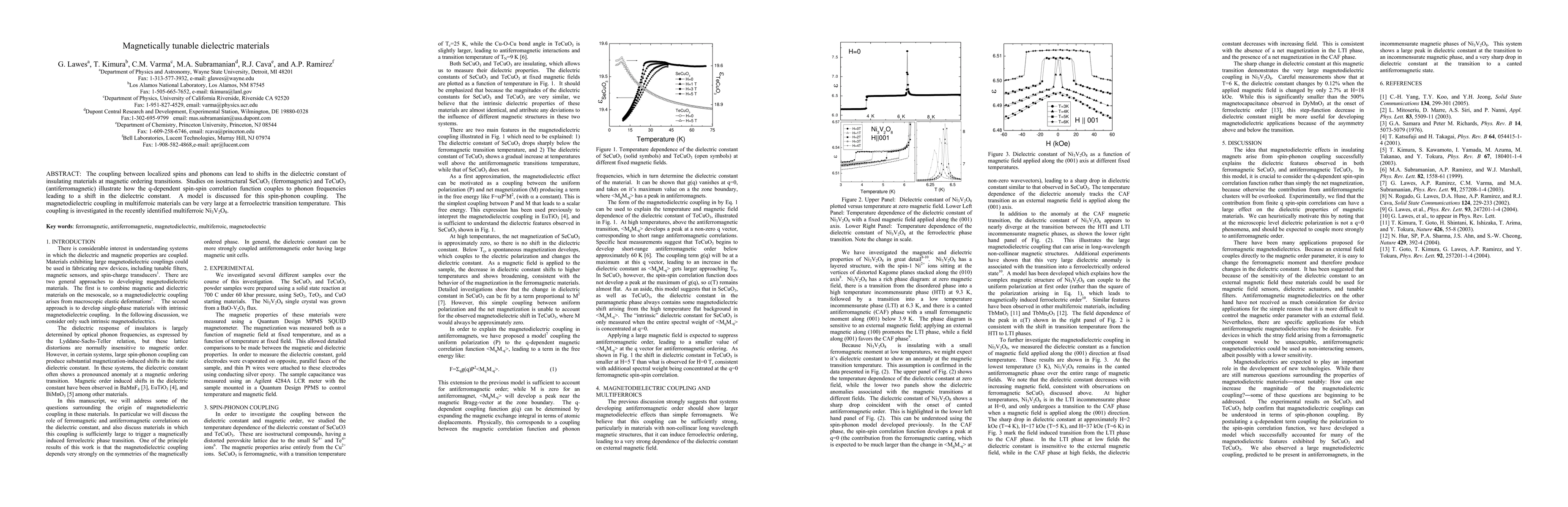 The coupling between localized spins and phonons can lead to shifts in the dielectric constant of insulating materials at magnetic ordering transitions. Studies on isostructural SeCuO3 (ferromagnetic) and TeCuO3 (antiferromagnetic) illustrate how the q-dependent spin-spin correlation function couples to phonon frequencies leading to a shift in the dielectric constant. A model is discussed for this spin-phonon coupling. The magnetodielectric coupling in multiferroic materials can be very large at a ferroelectric transition temperature. This coupling is investigated in the recently identified multiferroic Ni3V2O8.