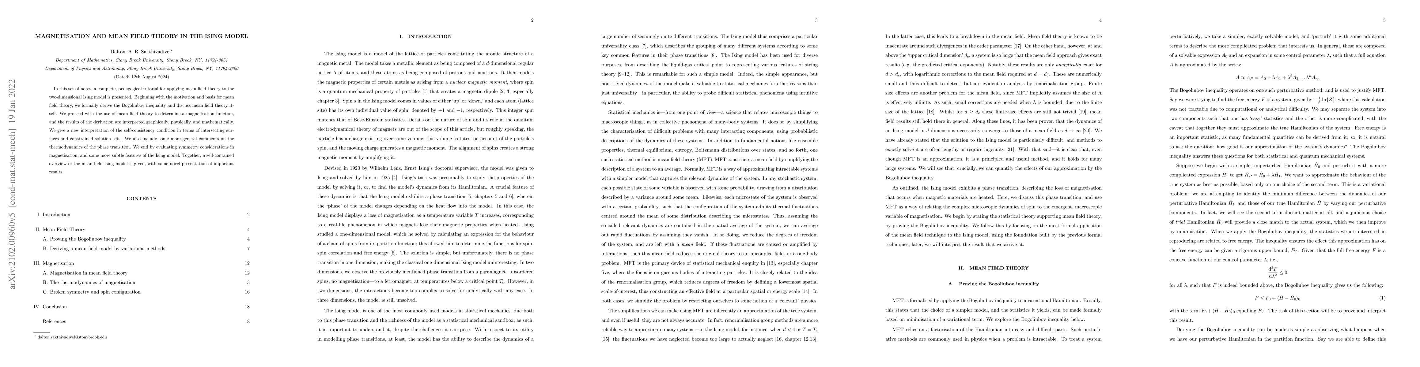 This paper provides a comprehensive tutorial on applying mean field theory to the two-dimensional Ising model, detailing the derivation of the magnetisation function and interpreting the results physically and mathematically. It also introduces a novel interpretation of the self-consistency condition and discusses the thermodynamics of the phase transition.