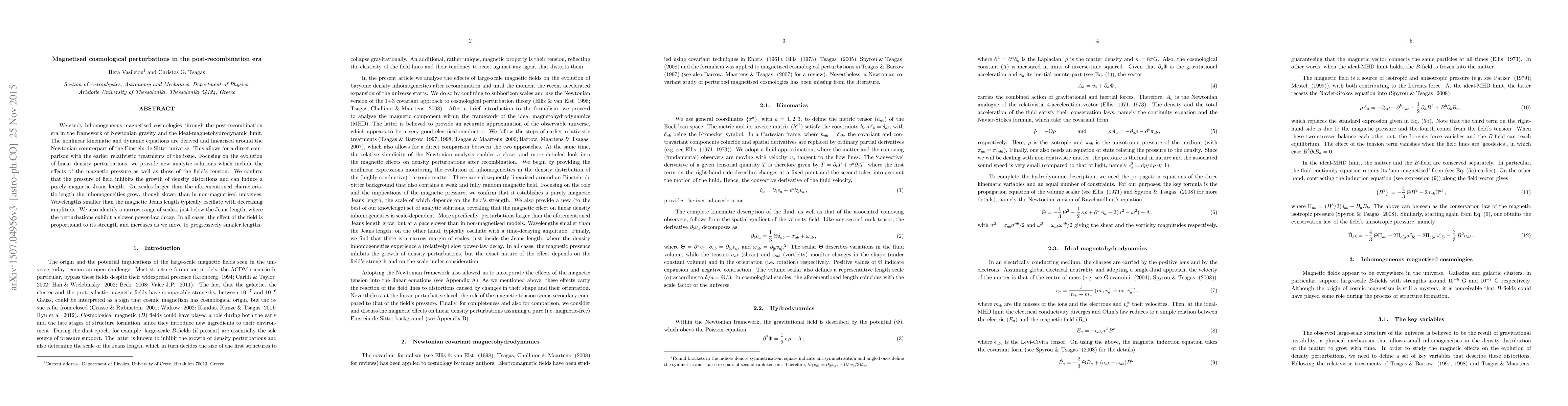 We study inhomogeneous magnetised cosmologies through the post-recombination era in the framework of Newtonian gravity and the ideal-magnetohydrodynamic limit. The nonlinear kinematic and dynamic equations are derived and linearised around the Newtonian counterpart of the Einstein-de Sitter universe. This allows for a direct comparison with the earlier relativistic treatments of the issue. Focusing on the evolution of linear density perturbations, we provide new analytic solutions which include the effects of the magnetic pressure as well as those of the field's tension. We confirm that the pressure of field inhibits the growth of density distortions and can induce a purely magnetic Jeans length. On scales larger than the aforementioned characteristic length the inhomogeneities grow, though slower than in non-magnetised universes. Wavelengths smaller than the magnetic Jeans length typically oscillate with decreasing amplitude. We also identify a narrow range of scales, just below the Jeans length, where the perturbations exhibit a slower power-law decay. In all cases, the effect of the field is proportional to its strength and increases as we move to progressively smaller lengths.