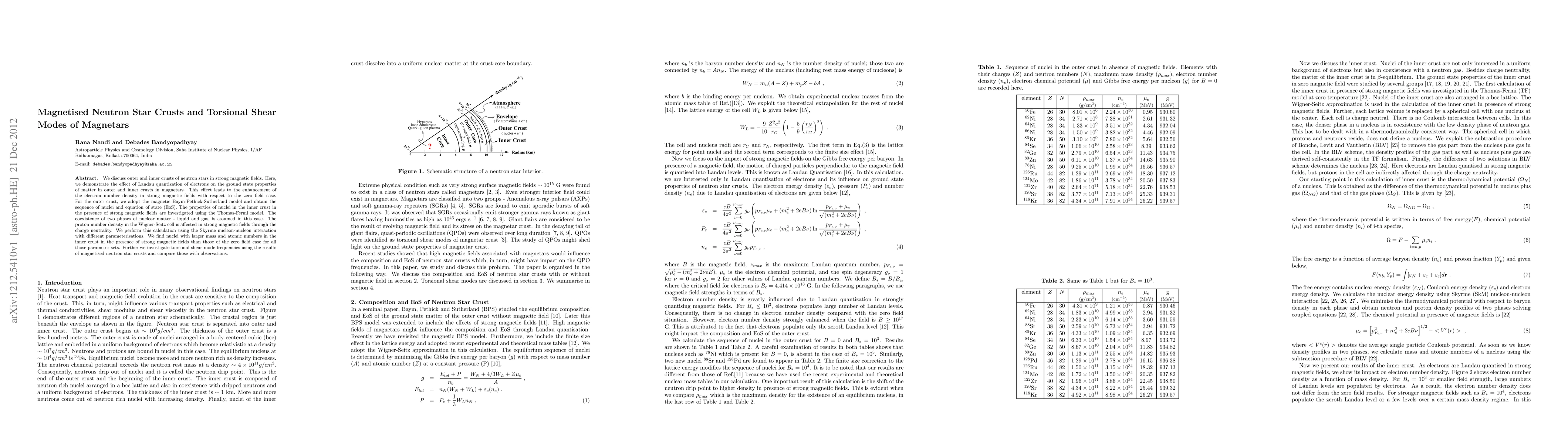 This paper investigates the effects of strong magnetic fields on the outer and inner crusts of neutron stars, particularly focusing on the Landau quantization of electrons and its impact on electron number density. It also explores torsional shear mode frequencies in magnetars and compares these findings with observational data.