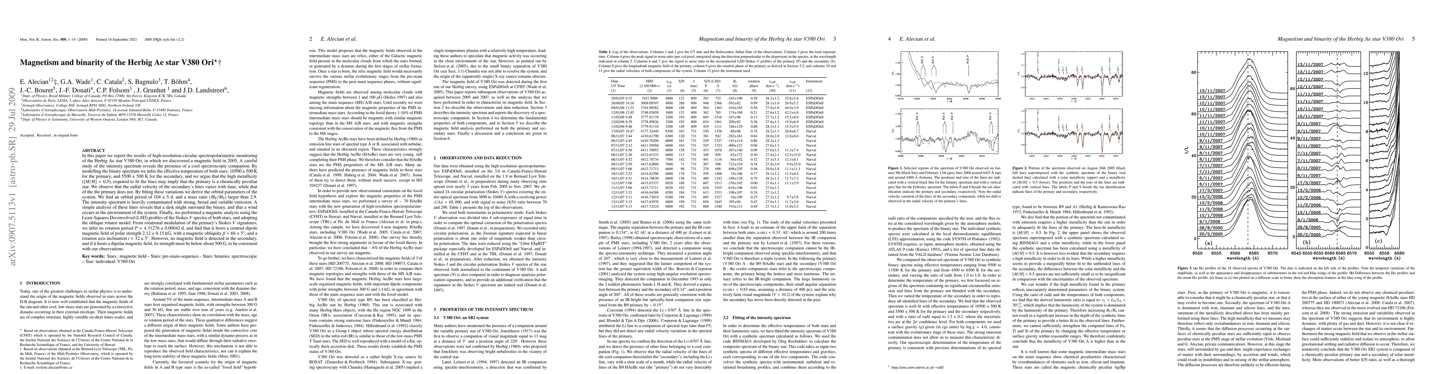 In this paper we report the results of high-resolution circular spectropolarimetric monitoring of the Herbig Ae star V380 Ori, in which we discovered a magnetic field in 2005. A careful study of the intensity spectrum reveals the presence of a cool spectroscopic companion. By modelling the binary spectrum we infer the effective temperature of both stars: $10500\pm 500$ K for the primary, and $5500\pm500$ K for the secondary, and we argue that the high metallicity ($[M/H] = 0.5$), required to fit the lines may imply that the primary is a chemically peculiar star. We observe that the radial velocity of the secondary's lines varies with time, while that of the the primary does not. By fitting these variations we derive the orbital parameters of the system. We find an orbital period of $104\pm5$ d, and a mass ratio ($M_{\rm P}/M_{\rm S}$) larger than 2.9. The intensity spectrum is heavily contaminated with strong, broad and variable emission. A simple analysis of these lines reveals that a disk might surround the binary, and that a wind occurs in the environment of the system. Finally, we performed a magnetic analysis using the Least-Squares Deconvolved (LSD) profiles of the Stokes $V$ spectra of both stars, and adopting the oblique rotator model. From rotational modulation of the primary's Stokes $V$ signatures, we infer its rotation period $P=4.31276\pm0.00042$ d, and find that it hosts a centred dipole magnetic field of polar strength $2.12\pm0.15$ kG, with a magnetic obliquity $\beta = 66\pm5^{\circ}$, and a rotation axis inclination $i=32\pm5^{\circ}$. However, no magnetic field is detected in the secondary, and if it hosts a dipolar magnetic field, its strength must be below about 500 G, to be consistent with our observations.