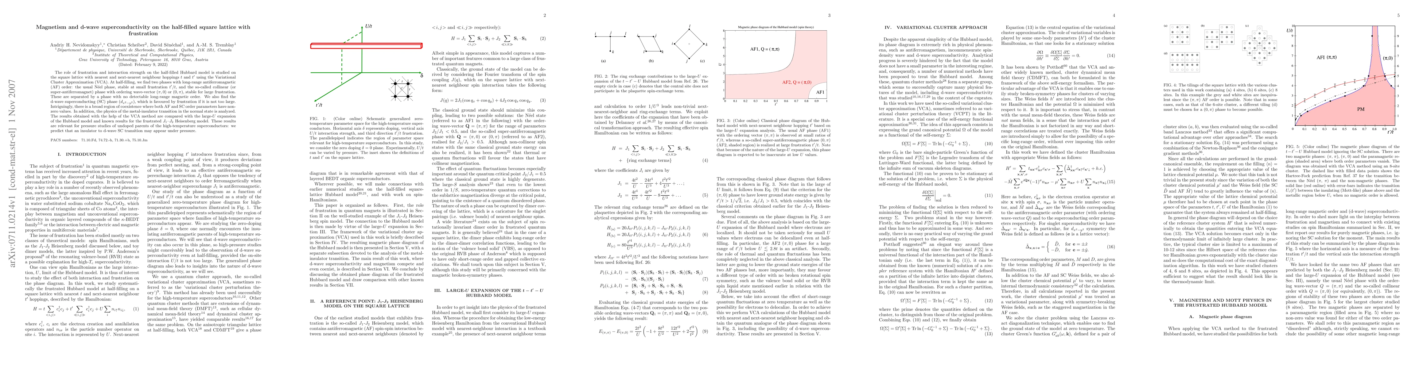 This study investigates the interplay of frustration and interaction strength in the half-filled Hubbard model on a square lattice using Variational Cluster Approximation. It reveals two antiferromagnetic phases separated by a phase without long-range order, and finds a d-wave superconducting phase favored by moderate frustration, with a coexistence region of both antiferromagnetic and superconducting orders.