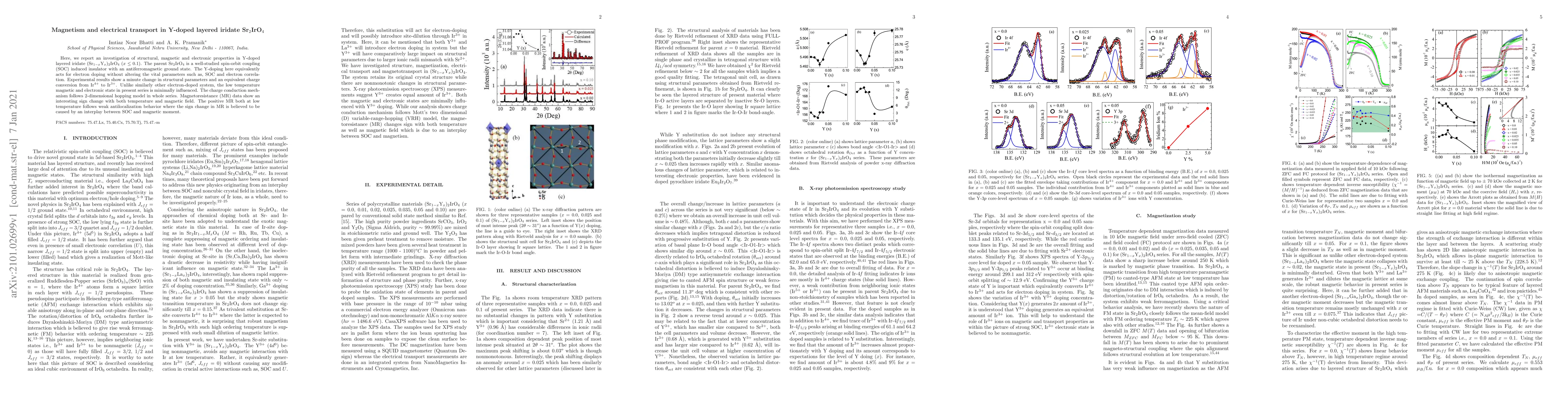 This study investigates the structural, magnetic, and electronic properties of Y-doped Sr$_2$IrO$_4$, revealing minimal structural changes and a 2-D hopping charge conduction model. The magnetism and electrical transport show an unusual sign change in magnetoresistance, attributed to the interplay between spin-orbit coupling and magnetic moment.