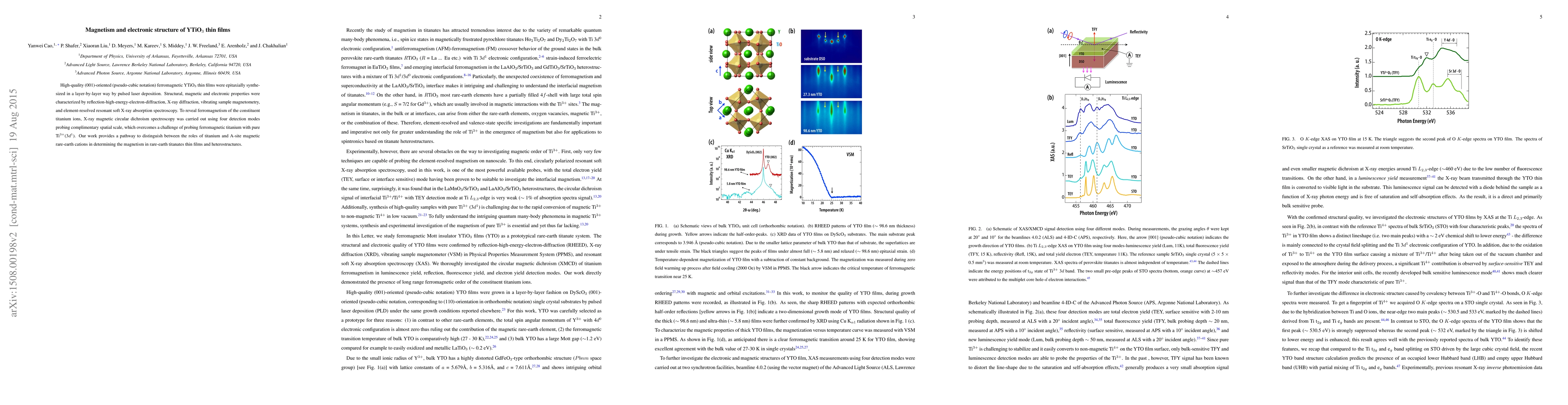 Researchers synthesized high-quality YTiO$_3$ thin films with ferromagnetic properties using pulsed laser deposition. They used various spectroscopic techniques to study the electronic structure and magnetism of titanium ions in these films.