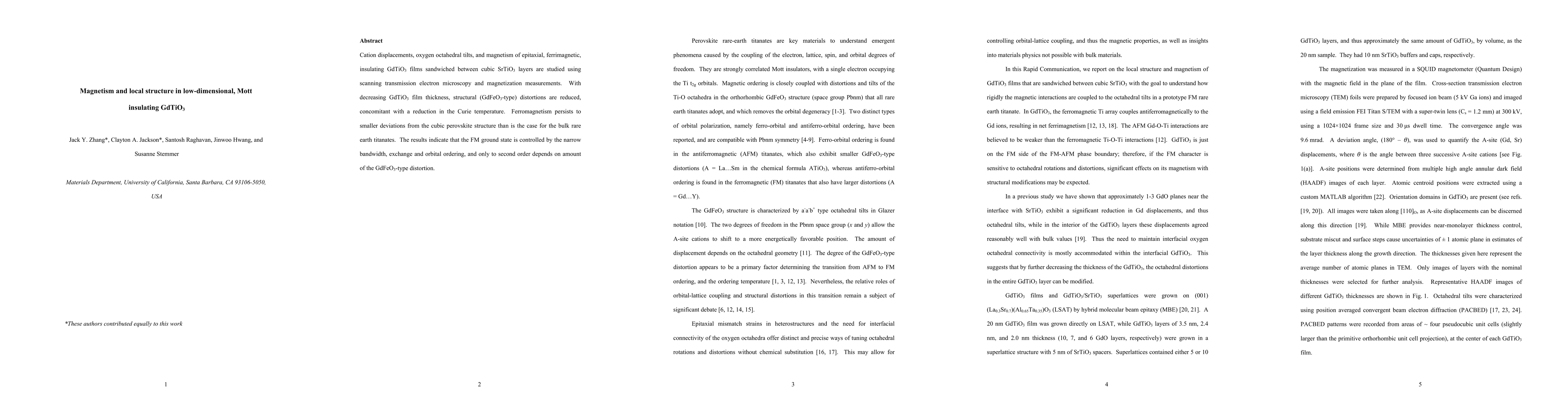 This study investigates the relationship between structural distortions and magnetism in thin films of GdTiO3 using electron microscopy and magnetization measurements. Despite reduced structural distortions with decreasing film thickness, ferrimagnetic behavior persists, suggesting that the narrow bandwidth and orbital ordering primarily control ferromagnetism, rather than the structural distortions.