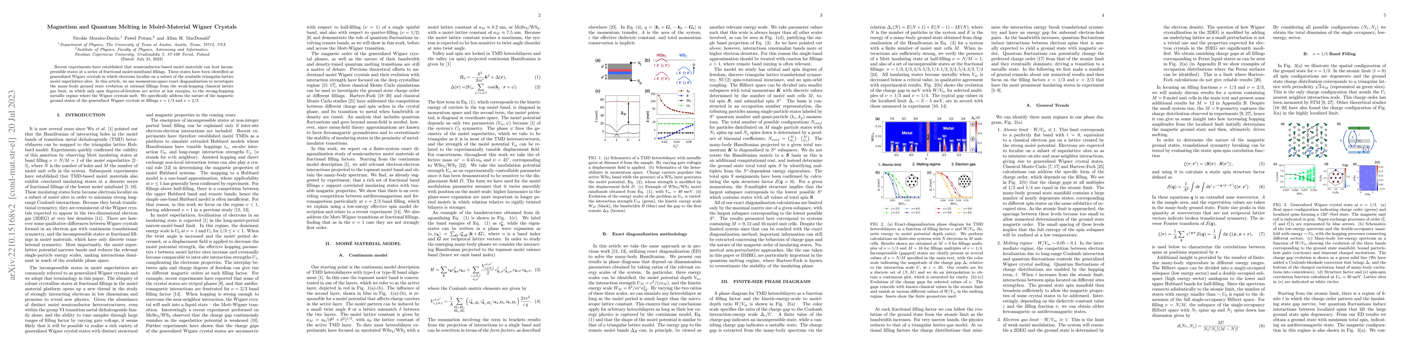 This research investigates the evolution of many-body ground states in moiré-material Wigner crystals, exploring the transition from localized electron states in the weak-hopping regime to melted states in the strong-hopping regime. It focuses on the magnetic properties of generalized Wigner crystals at fractional fillings of 1/3 and 2/3, revealing insights into their quantum melting.