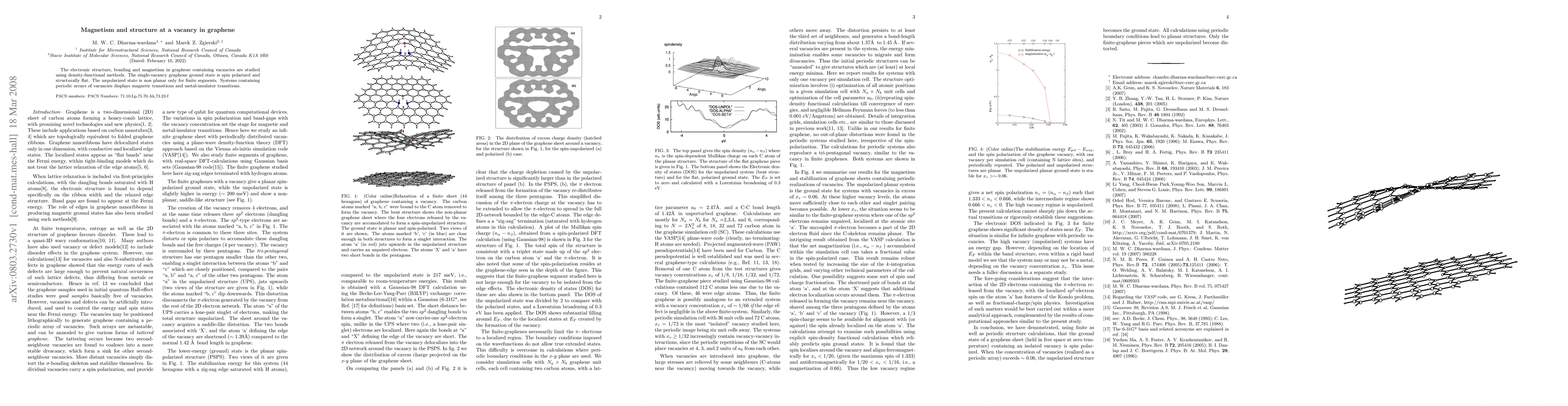 The paper presents a detailed analysis of the electronic structure, bonding, and magnetism in graphene with vacancies using advanced density-functional theory methods.