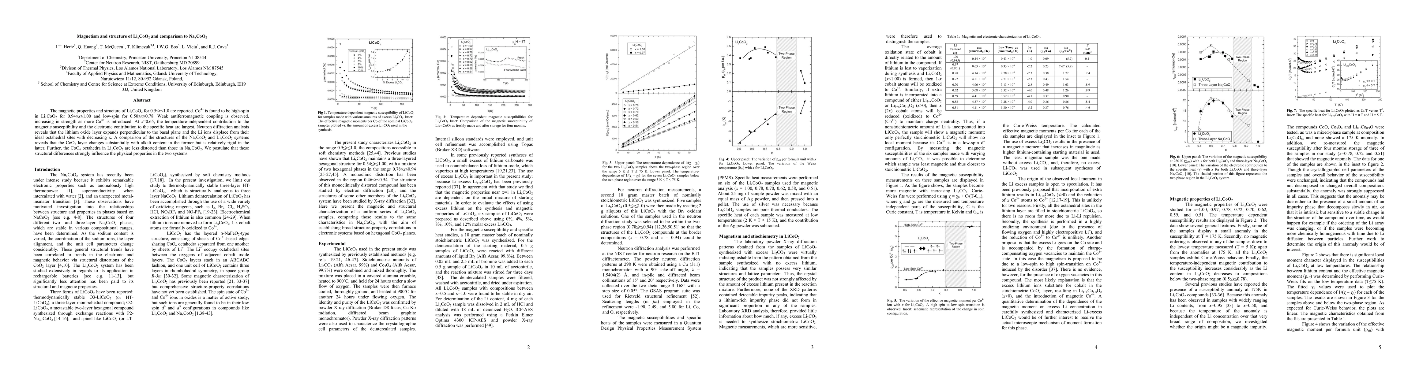 The magnetic properties and structure of LixCoO2 for x between 0.5 and 1.0 are reported. Co4+ is found to be high-spin in LixCoO2 for x between 0.94 and 1.0 and low-spin for x between 0.50 and 0.78. Weak antiferromagnetic coupling is observed, increasing in strength as more Co4+ is introduced. At an x value of about 0.65, the temperature-independent contribution to the magnetic susceptibility and the electronic contribution to the specific heat are largest. Neutron diffraction analysis reveals that the lithium oxide layer expands perpendicular to the basal plane and the Li ions displace from their ideal octahedral sites with decreasing x. A comparison of the structures of the NaxCoO2 and LixCoO2 systems reveals that the CoO2 layer changes substantially with alkali content in the former but is relatively rigid in the latter. Further, the CoO6 octahedra in LixCoO2 are less distorted than those in NaxCoO2. We postulate that these structural differences strongly influence the physical properties in the two systems.